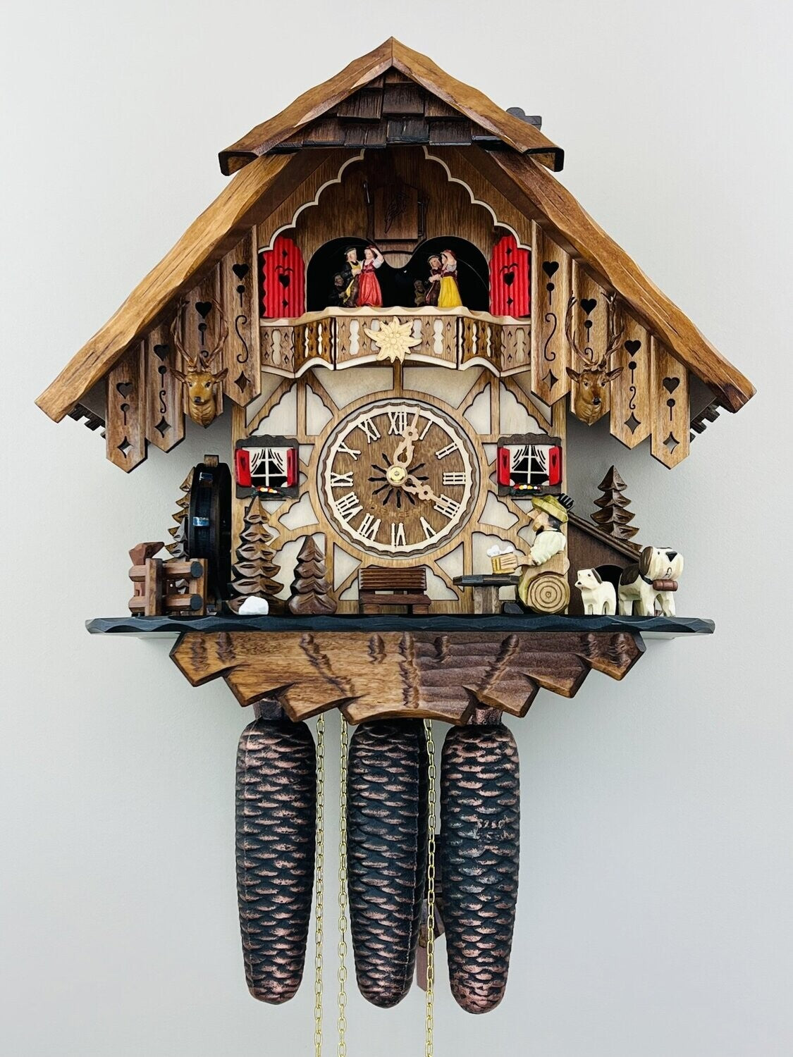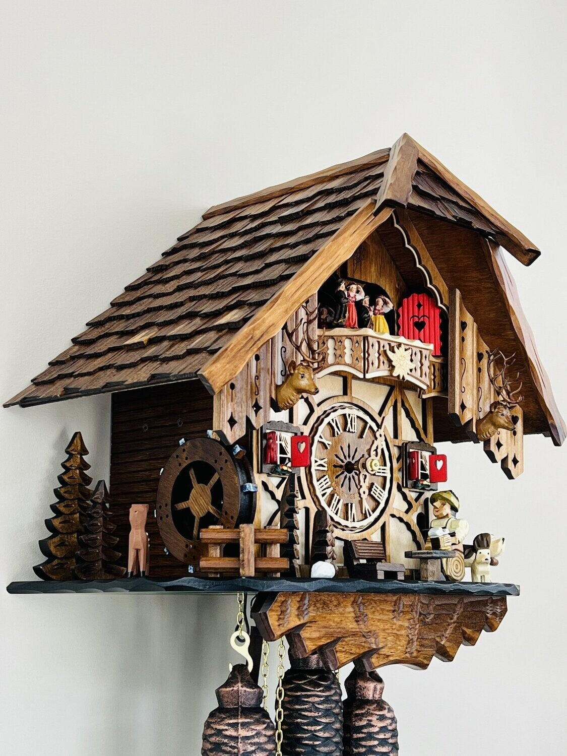 This eight day musical cuckoo clock features a detailed cottage design with a beer drinker who raises his mug at the top of every hour. The clock includes hand made figurines and a moving waterwheel for added visual interest. It plays two classic melodies and has rotating dancers that turn while the music plays. Measuring 14 inches high, 14 inches wide, and 9.5 inches deep, it fits well on most interior walls in living spaces, hallways, or themed rooms. The mechanical movement winds once every eight days by pulling the three brass chains. Built from durable materials, it includes a two year limited warranty for added confidence.