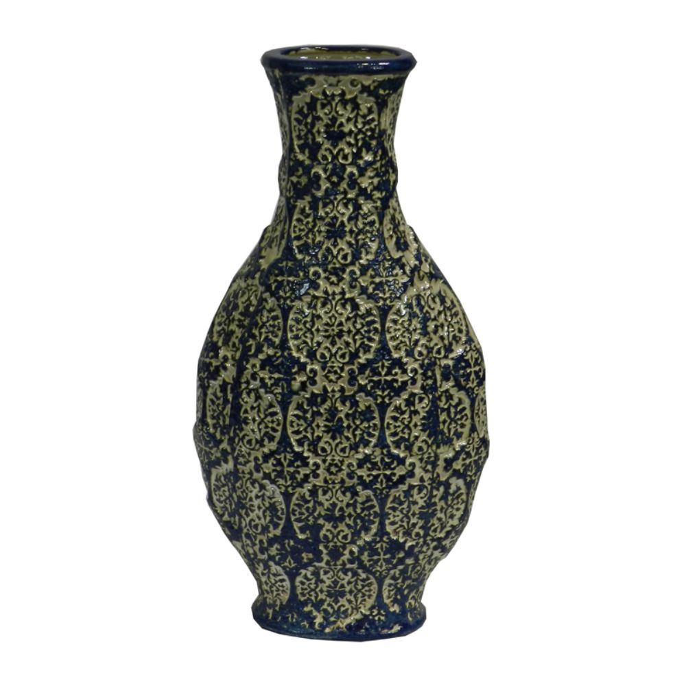 All vase lovers will certainly want to bring home an elegant vase like this one here. This vase features lovely floral detailing all over. This gives it a Decorative look. In the combination of black and green, it will easily get well along with all home themes. This vase will look amazing on a side table, at the center of the dining table or on a glass wall ledge. This is one such vase that will stand out in front of other Decors in your house.