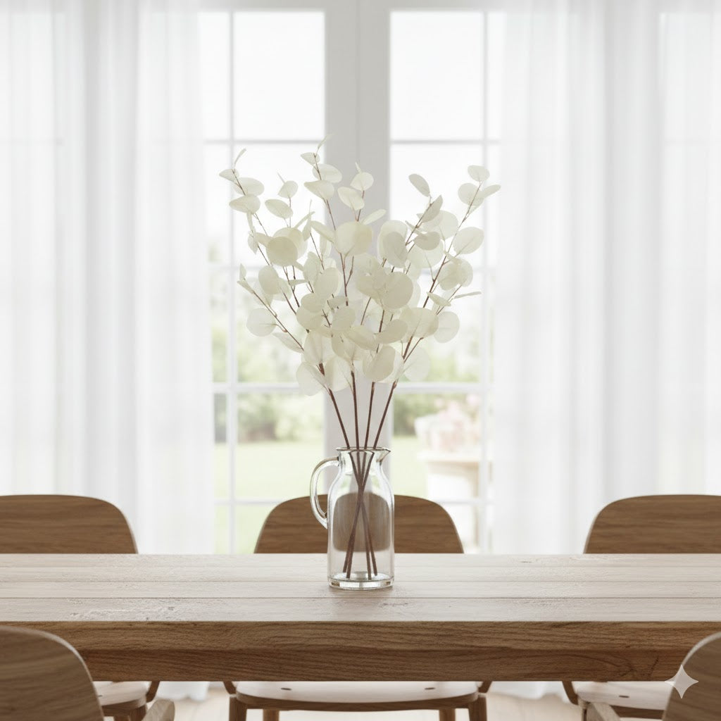 Enhance indoor spaces with this set of 6 Ivory Silver Dollar Faux Eucalyptus Leaf Sprays by Melrose. Each spray stands 34" tall and features white polyester leaves on durable plastic stems, creating lifelike eucalyptus foliage. Perfect for vases, centerpieces, or floral arrangements, these sprays add texture and elegance to living rooms, dining areas, or offices. Crafted for long-lasting indoor use, they provide year-round visual interest without maintenance. Sold as a set of six, these sprays allow for coordinated décor arrangements. Each spray measures 8" long by 2.5" wide by 34" high, offering a statement look in any indoor floral display.