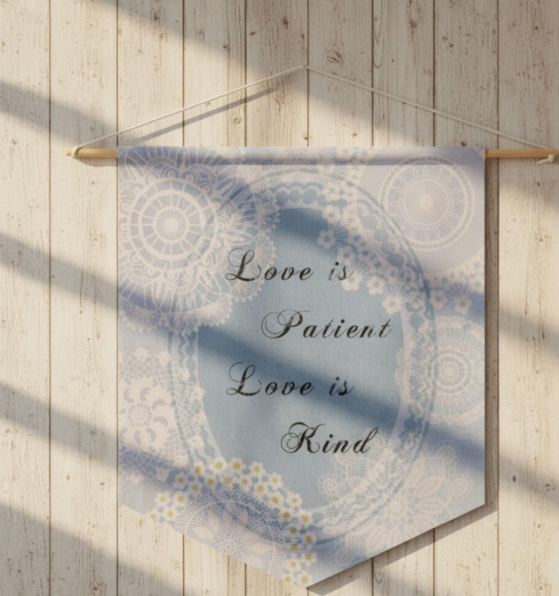 Share a message of enduring love and faith with the Religious Toile “Love Is Patient” Pennant. Measuring 18x21 inches, this 100% polyester wall hanging features a timeless toile design surrounding the beloved 1 Corinthians 13:4 verse. Its soft, durable fabric and detailed print make it a meaningful accent for living rooms, prayer spaces, or bedrooms. The lightweight construction allows for easy hanging, while the neutral tones blend seamlessly with a variety of décor styles. Perfect as a thoughtful gift or daily reminder, this pennant adds elegance, inspiration, and heartfelt sentiment to any home or faith-centered space.