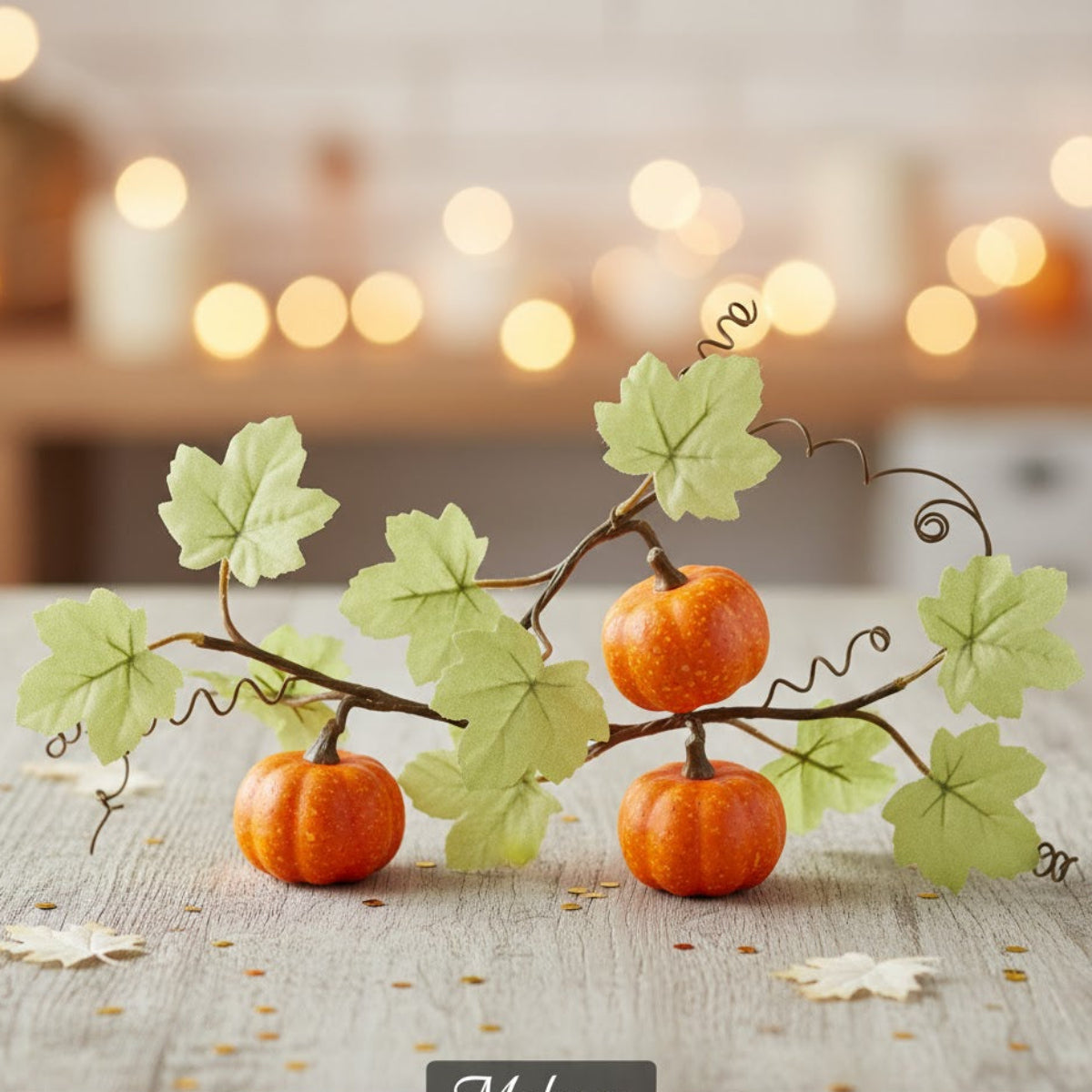 This fall pumpkin vine set brings seasonal color and texture to indoor autumn and Thanksgiving decorating. Crafted from foam, polyester, and supportive wire, each vine features pumpkin accents in warm green and orange tones designed to add dimension and visual interest. The flexible construction allows for easy styling in vases, wreaths, garlands, or tabletop displays. Ideal for creating balanced seasonal arrangements, these vines offer a durable decorative solution that can be reused year after year. Each piece measures 11 inch length by 4 inch width with a 21.25 inch height profile. Intended for indoor use only.