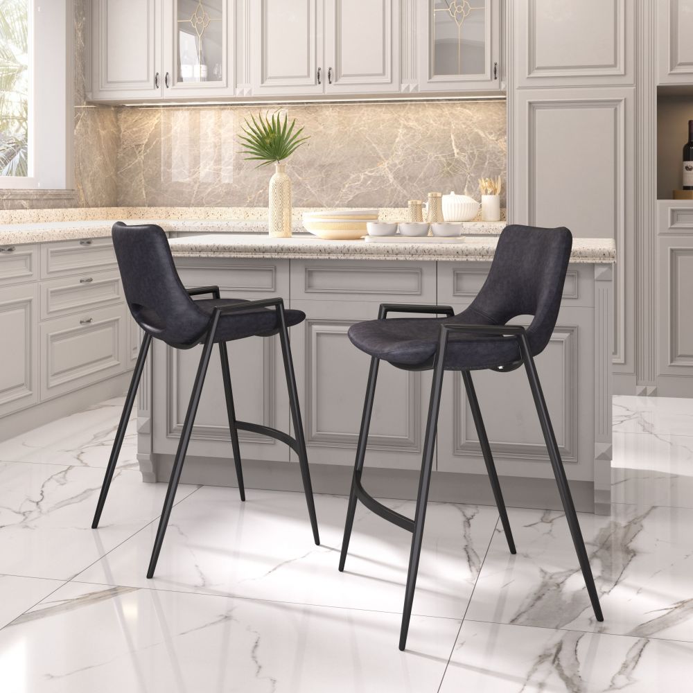 Bring mid-century modern flair to your kitchen or bar area with the Desi Counter Stool Set by Zuo Modern. Designed with urban lines and built for both residential and hospitality use, this set features black faux leather upholstery, ergonomic armrests, and a sturdy black powder-coated steel frame. The seat design offers both style and support, while the footrest enhances comfort for extended sitting.