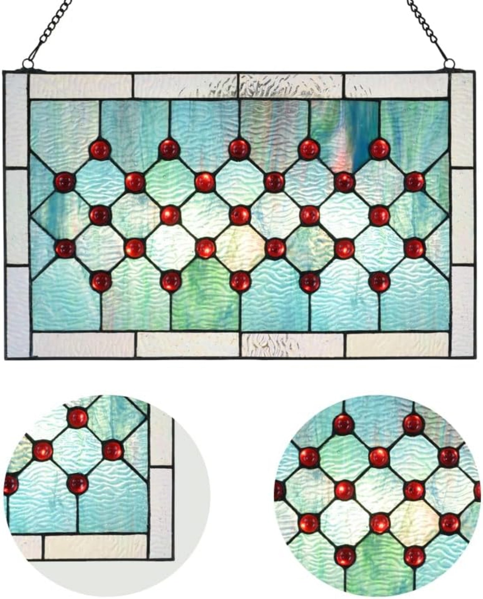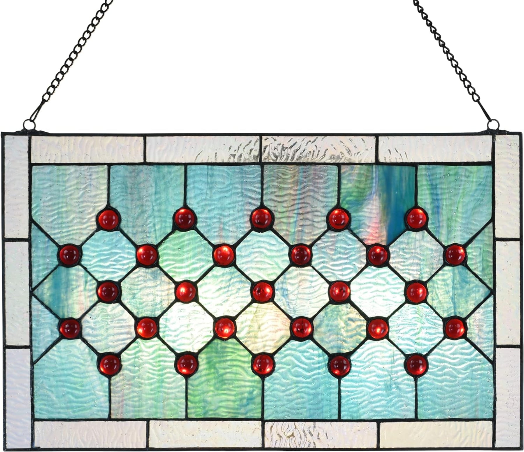 A stained glass window panel that emulates the calming colors of a crystal clear blue ocean. This beautifully hand-crafted stained glass window panel adds character and charm to any room. It has a simple and elegant geometric design, featuring 73 pieces of 100% genuine stained glass and cabochon. When illuminated from behind with sunlight, its tones of blue, green, and red will transform and brighten the home with multicolored light. The size of the horizontal window hanging is 19.3" L x 11.8" H. The frame is welded with 2 small hooks and comes equipped with a chain for easy installation.
