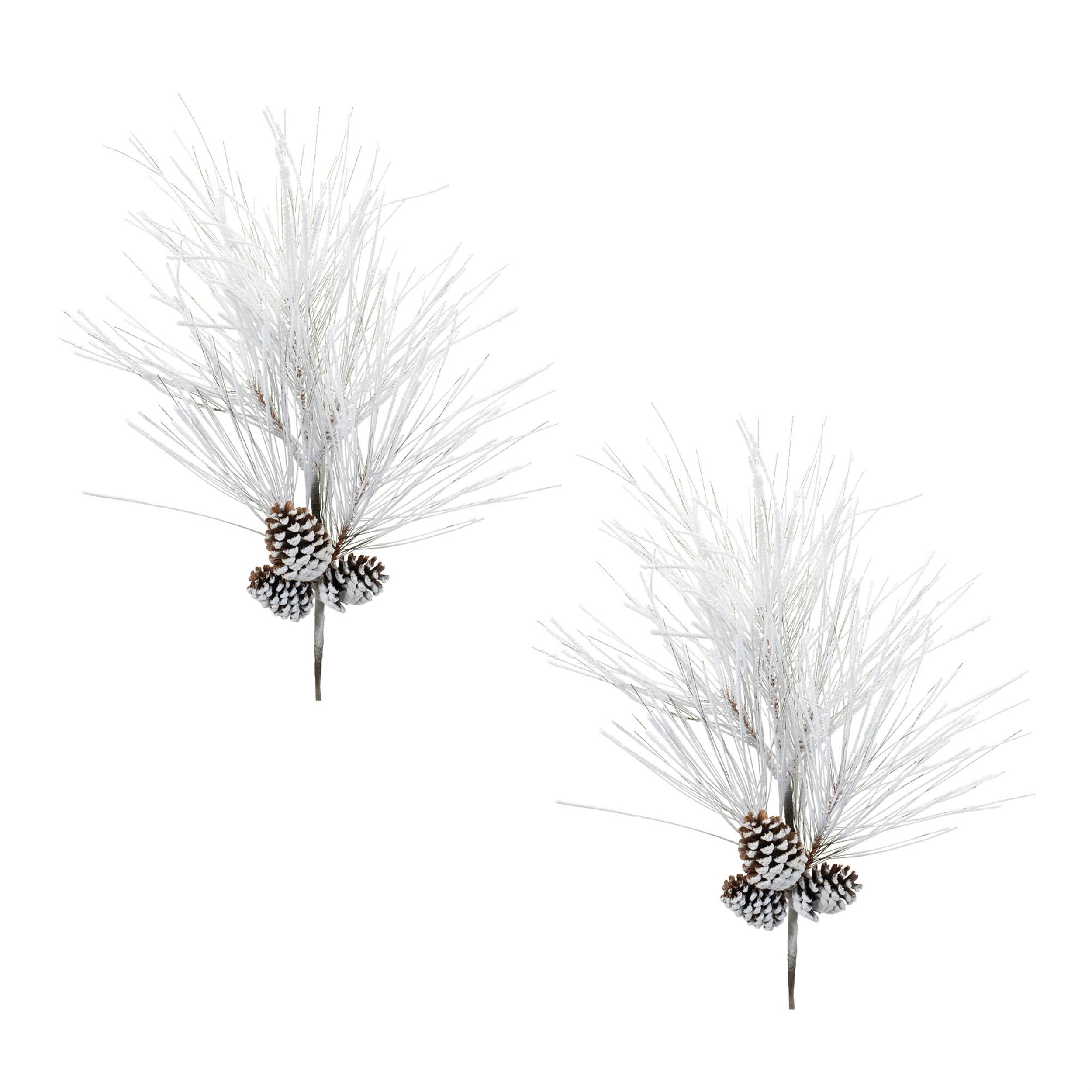 This flocked pine spray adds natural texture and a winter-inspired look to seasonal décor. Measuring 36 inches tall, each spray features long needle pine branches finished with a snowy flocked coating in soft white and brown tones. Natural pinecone accents enhance the rustic appearance, while the iron-wired stem allows for easy shaping and secure placement. Designed for versatile styling, these sprays work well in wreaths, garlands, floral arrangements, or seasonal porch pots. Sold as a set of two, this flocked pine spray offers a simple way to layer greenery and create cohesive holiday displays.