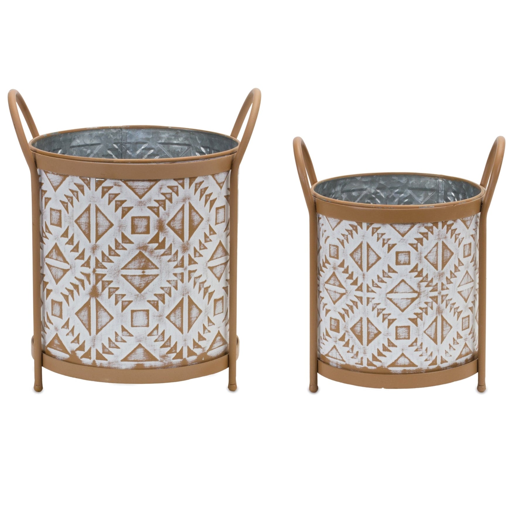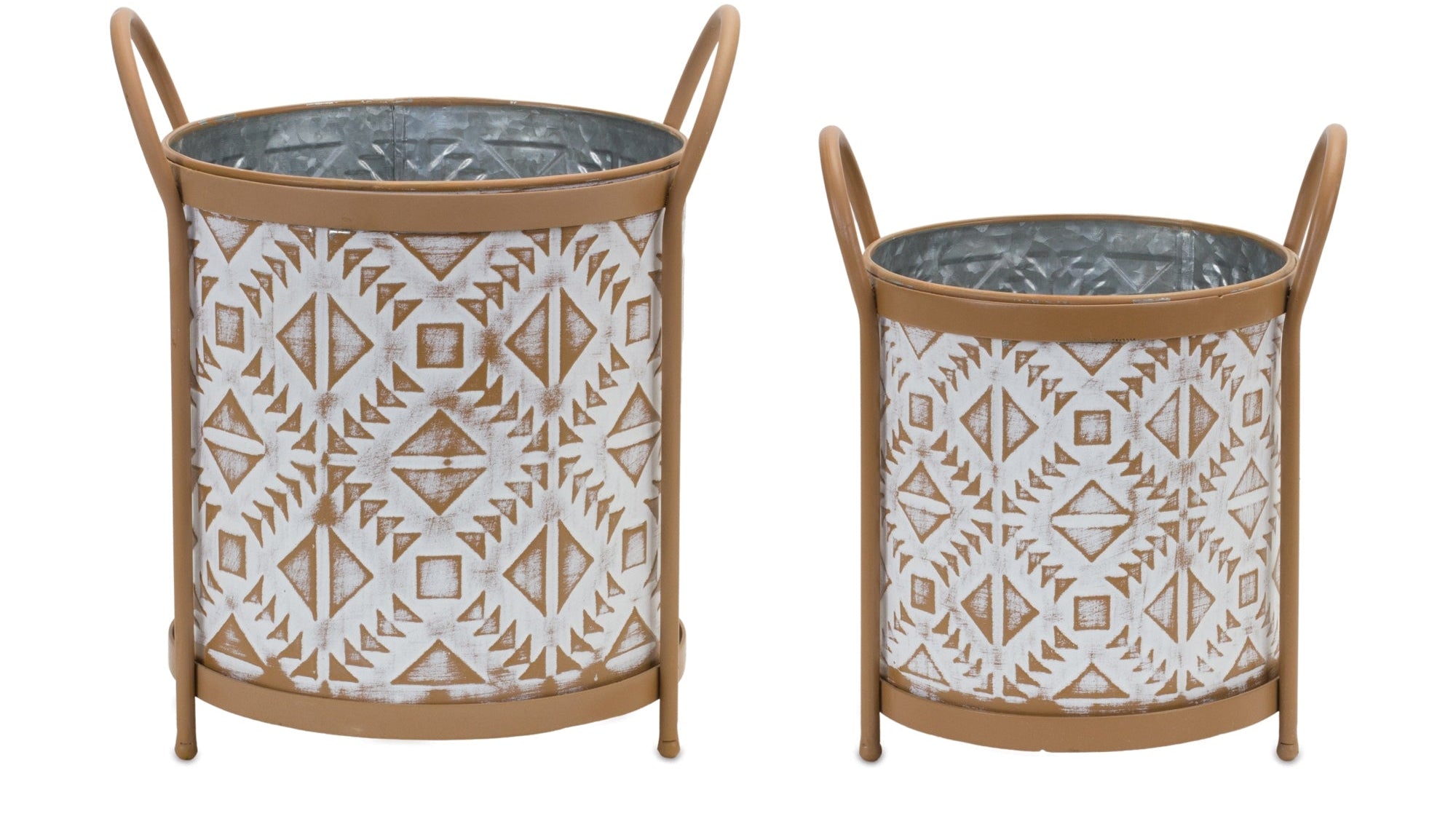 Add a touch of global-inspired artistry to your home or patio with the Footed Metal Aztec Planter Set by Melrose. Featuring distressed tones of grey, white, and beige, each planter showcases a bold Aztec geometric pattern that enhances any modern or boho-inspired space. Crafted from durable zinc metal, these planters include elegant footed bases that elevate your plants for a refined, stylish presentation. Perfect for faux plants, succulents, or seasonal floral arrangements, they bring warmth and visual interest to living rooms, entryways, patios, or covered outdoor areas. Sold as a coordinated set of two sizes, they create a balanced and striking decorative display anywhere you choose to place them.