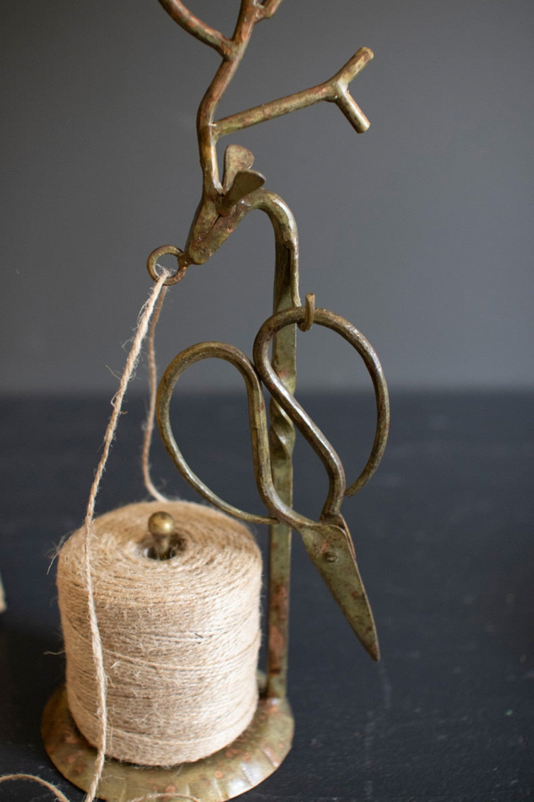 This forged iron deer jute holder combines decorative charm with everyday function. Crafted from metal with a warm gold-toned finish, the deer figure stands gracefully while holding a spool of jute, adding a playful yet practical accent to your space. The rustic metal texture gives it a woodland-inspired look that works well in kitchens, craft rooms, or styled shelves and vignettes. Designed to be both useful and decorative, this piece brings character and seasonal warmth while keeping jute easily accessible. It’s a functional accent that feels imaginative without overpowering your décor.