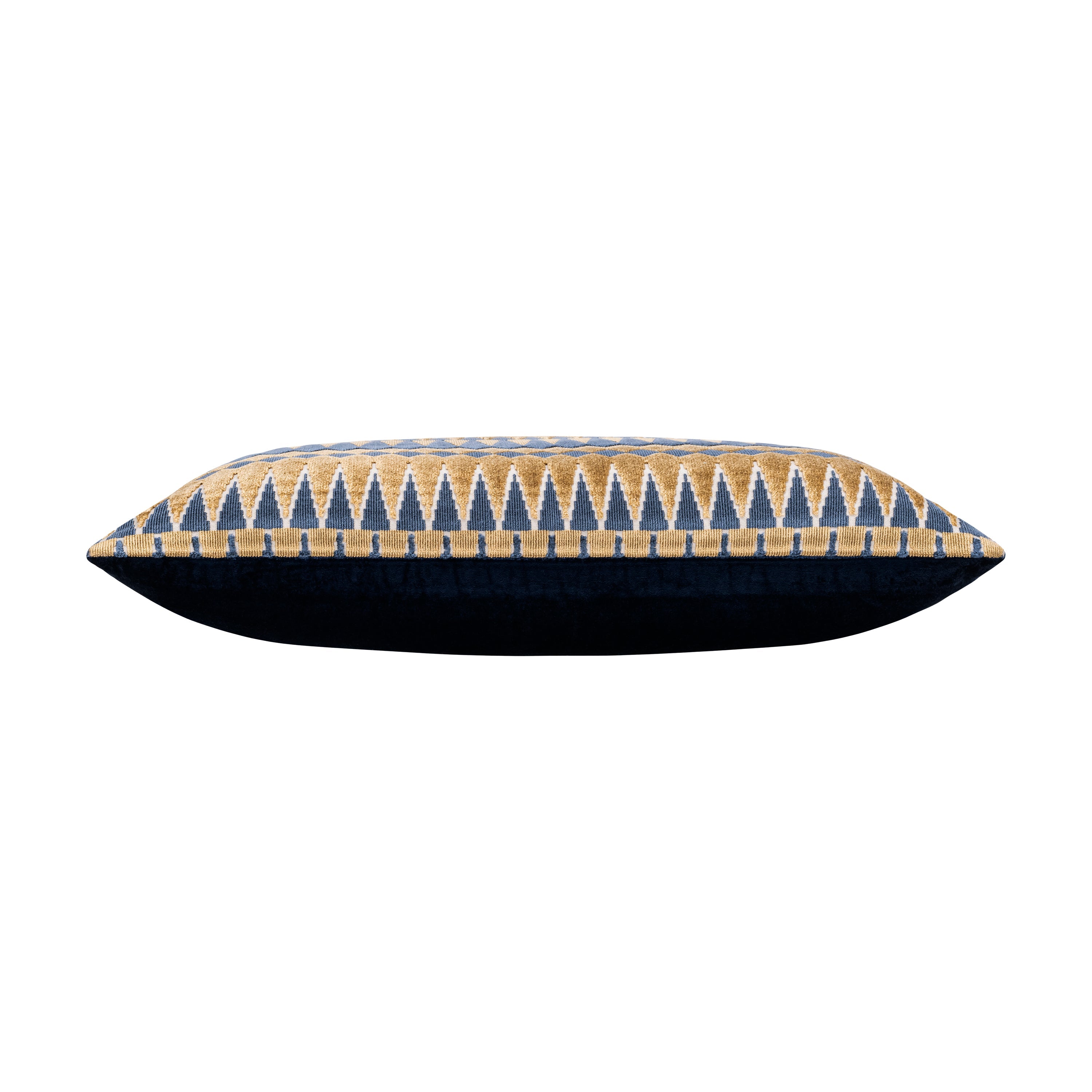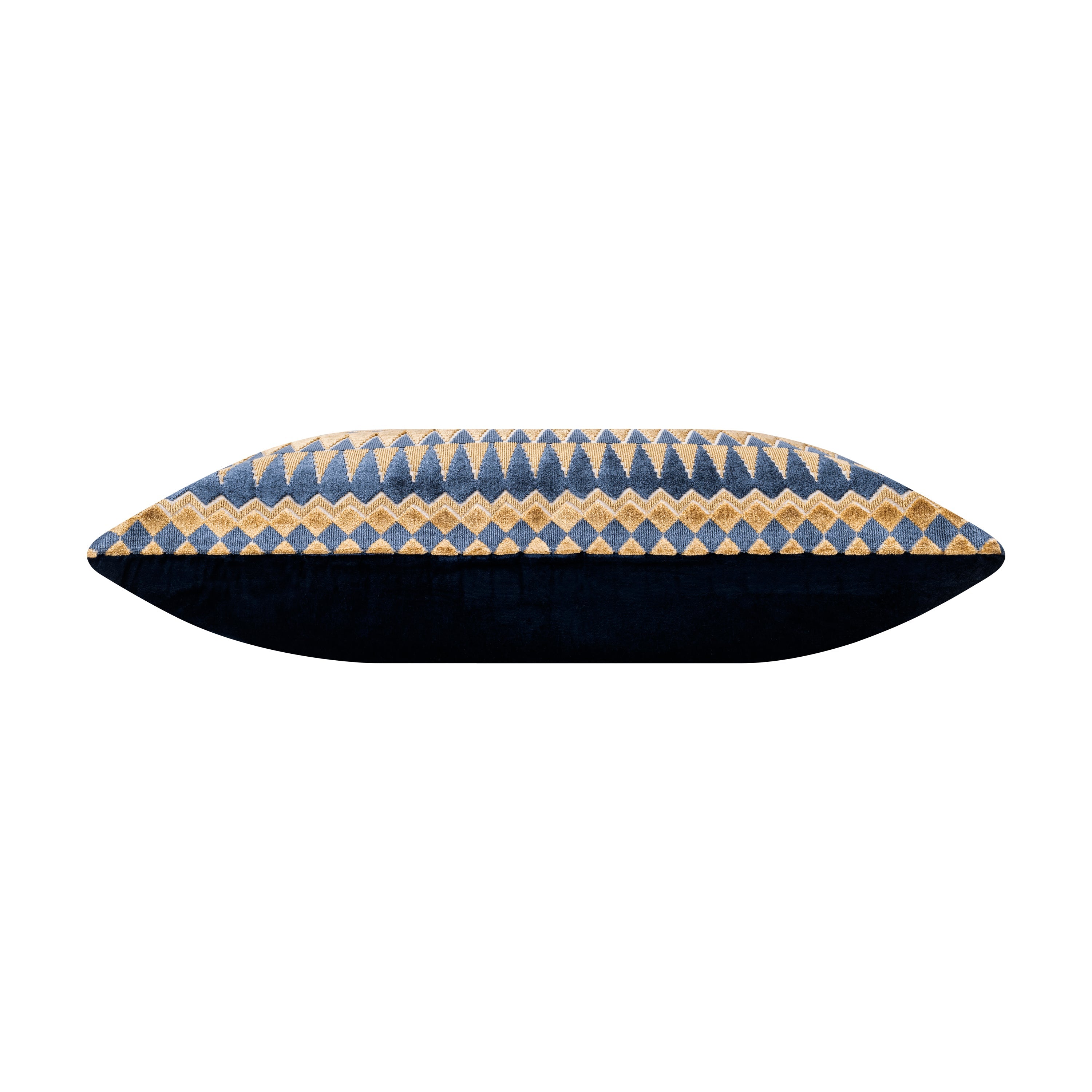 Introduce refined elegance to your interior with the Fortune Pillow, a statement accent featuring an alluring geometric pattern in rich blue and gold tones. The front showcases a beautifully woven velvet jacquard design that delivers dimension and texture, while the coordinating solid blue velvet back offers a smooth, luxurious finish.