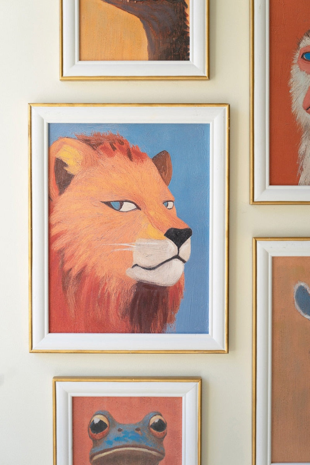 - Set includes five coordinated framed animal portraits for ready-to-hang decor