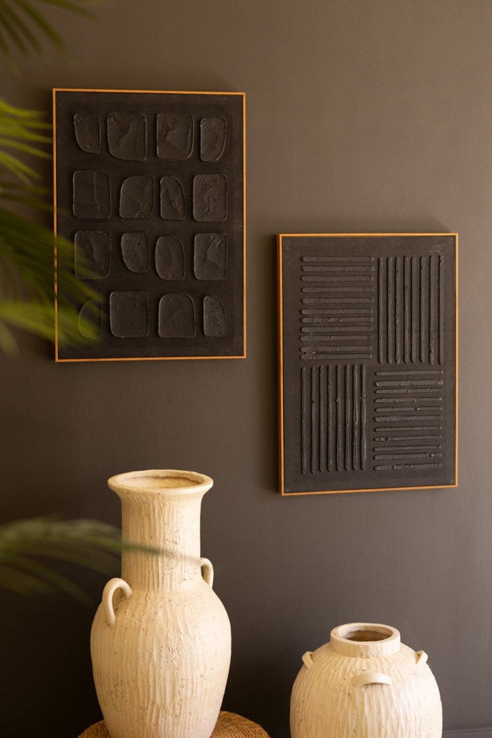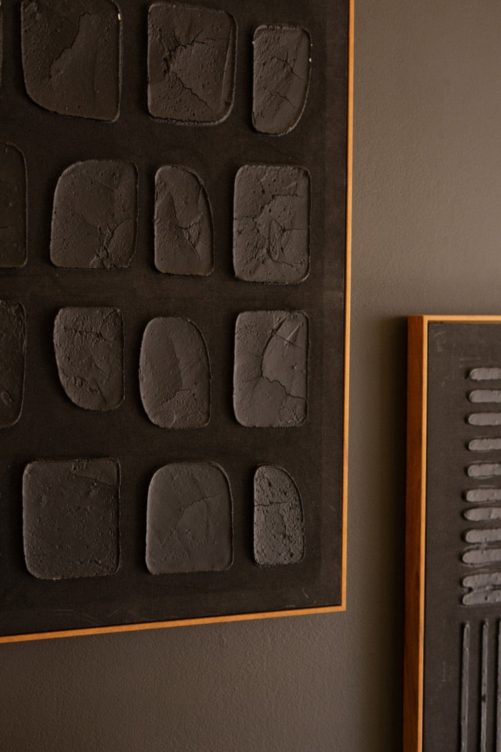 - Set of two framed abstract wall art pieces in rich black tones.