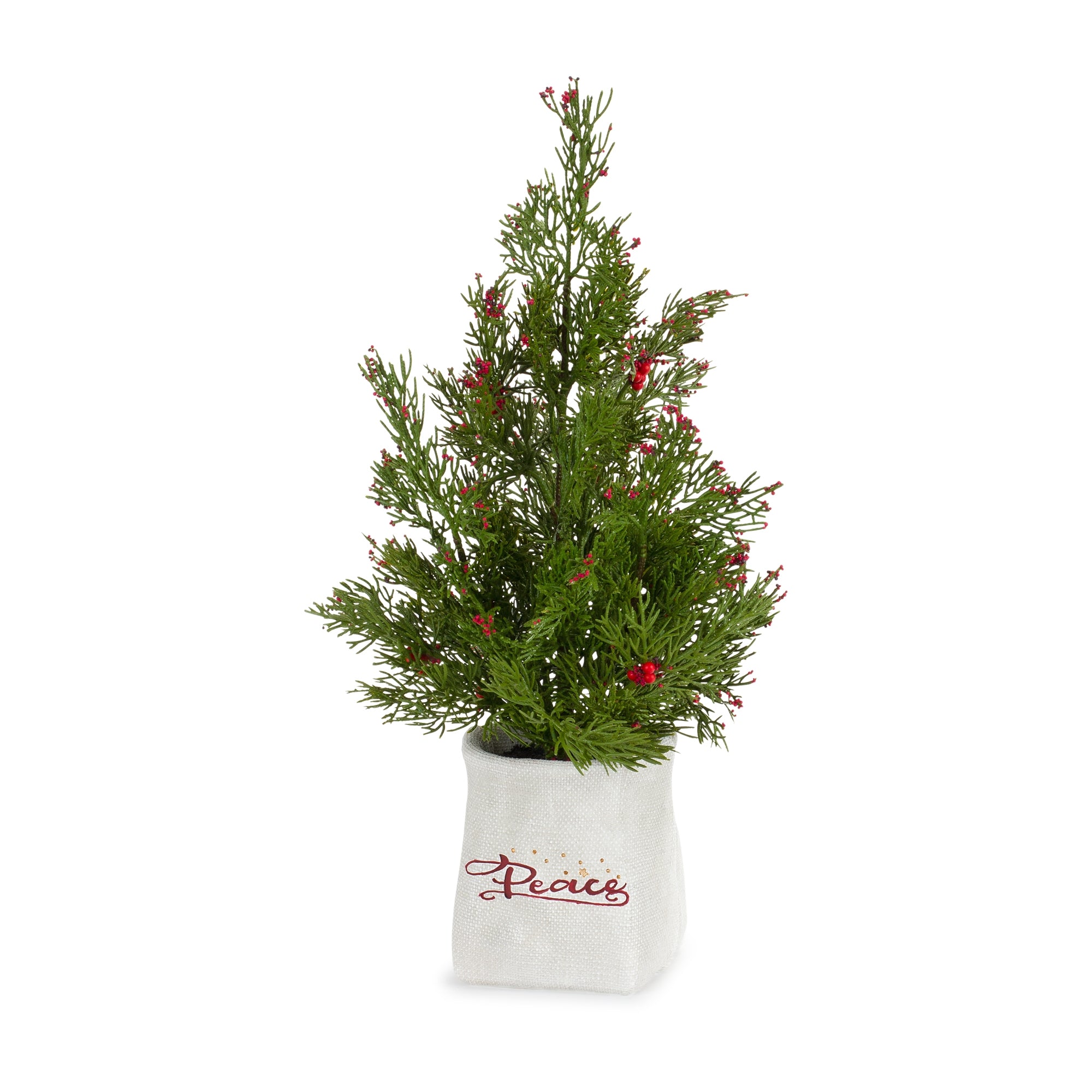 The Mini Pine Tree with Berries in Ceramic Pot Set brings festive charm to any holiday space with its lush green pine branches, white frosted accents, and bright red berries. This set includes two sizes—14.25 inches and 16.5 inches—each nestled in a decorative ceramic pot featuring “Joy” and “Peace” sentiments for added seasonal warmth. Crafted from durable PE for a realistic appearance, these potted trees are perfect for tabletops, entryways, mantels, and covered outdoor areas. Their compact size makes them ideal for accenting small spaces or pairing with larger holiday décor. Designed for repeated seasonal use, this set adds a cheerful, inviting touch to your Christmas displays.