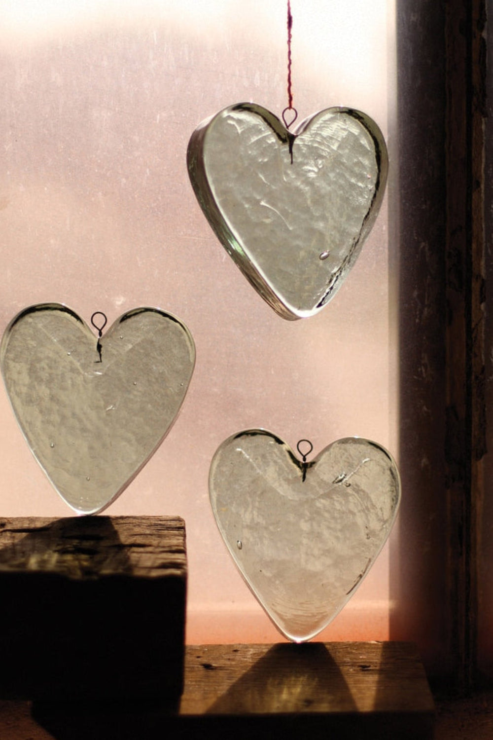 artisan glass heart set,blue green glass ornament,blue tinted glass heart,decorative glass hearts set,eco friendly glass gift,garden window suncatcher,glass heart suncatcher,handcrafted glass ornament,handmade glass window charm,hanging glass heart decoration,Kalalou glass suncatcher,Natural Noel,recycled glass heart décor,sustainable home décor glass,translucent glass heart décor