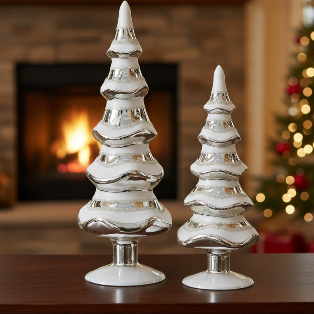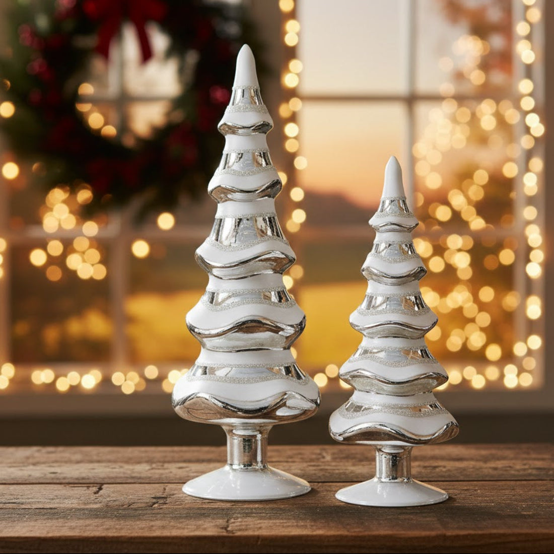 Christmas Mantle Tree Decor,Decorative Accents,Elegant Holiday Table Trees,Frosted Christmas Tabletop Decor,Glass Pine Tree Duo,Holiday Glass Tree Set of 2,Luxe Decor,Silver White Christmas Trees,Small Glass Christmas Tree Set,Snowy Glass Pine Tree Set,Tabletop Christmas Tree Glass,Winter Decor Glass Trees