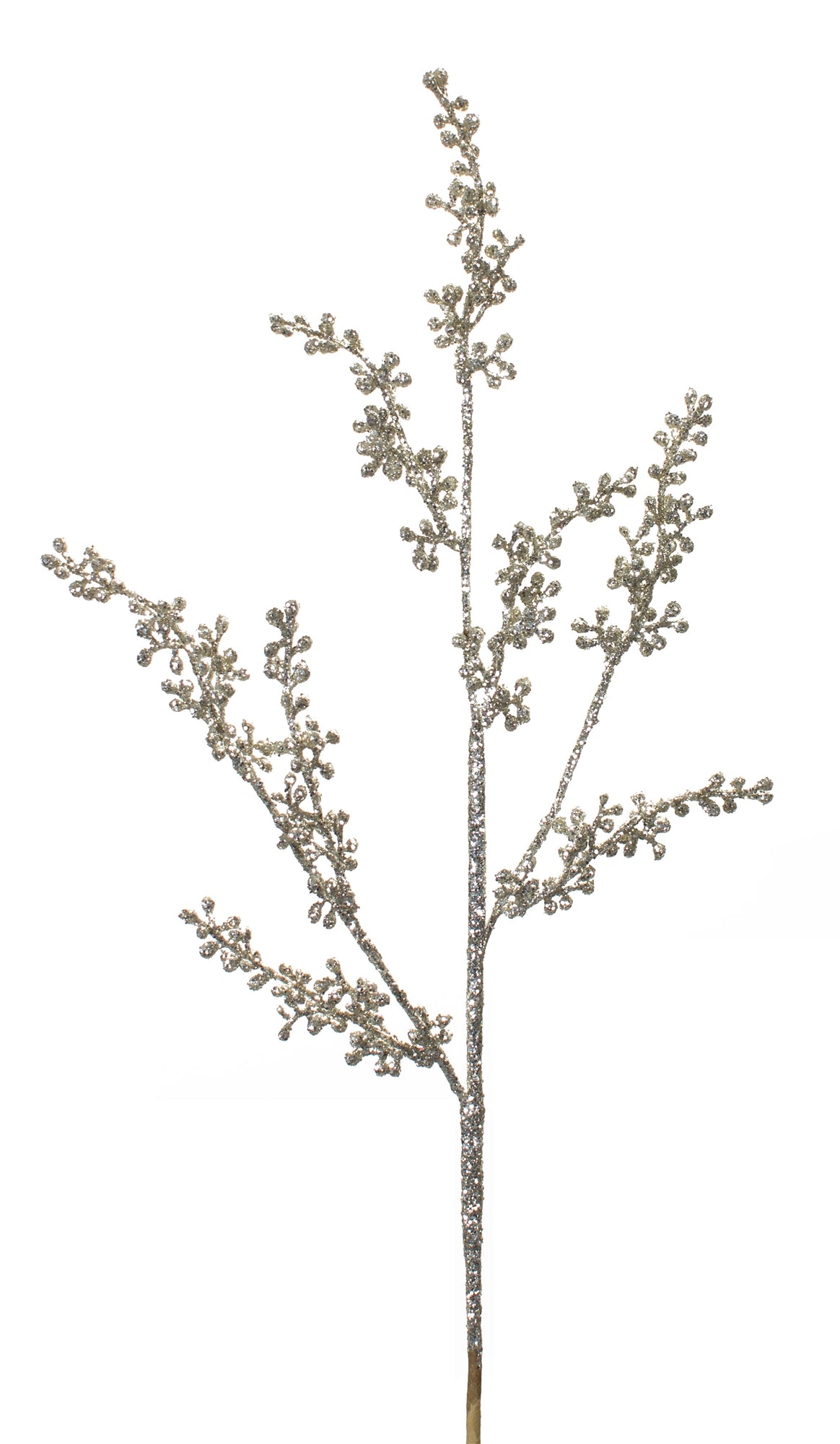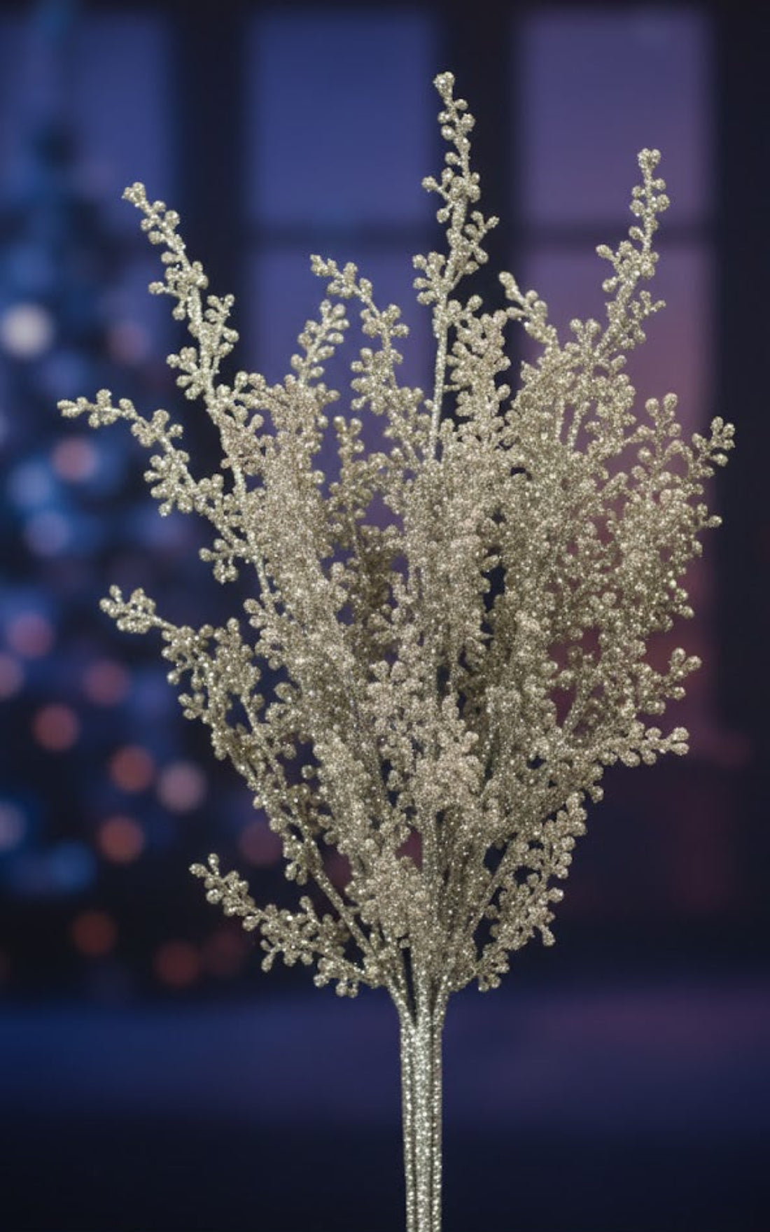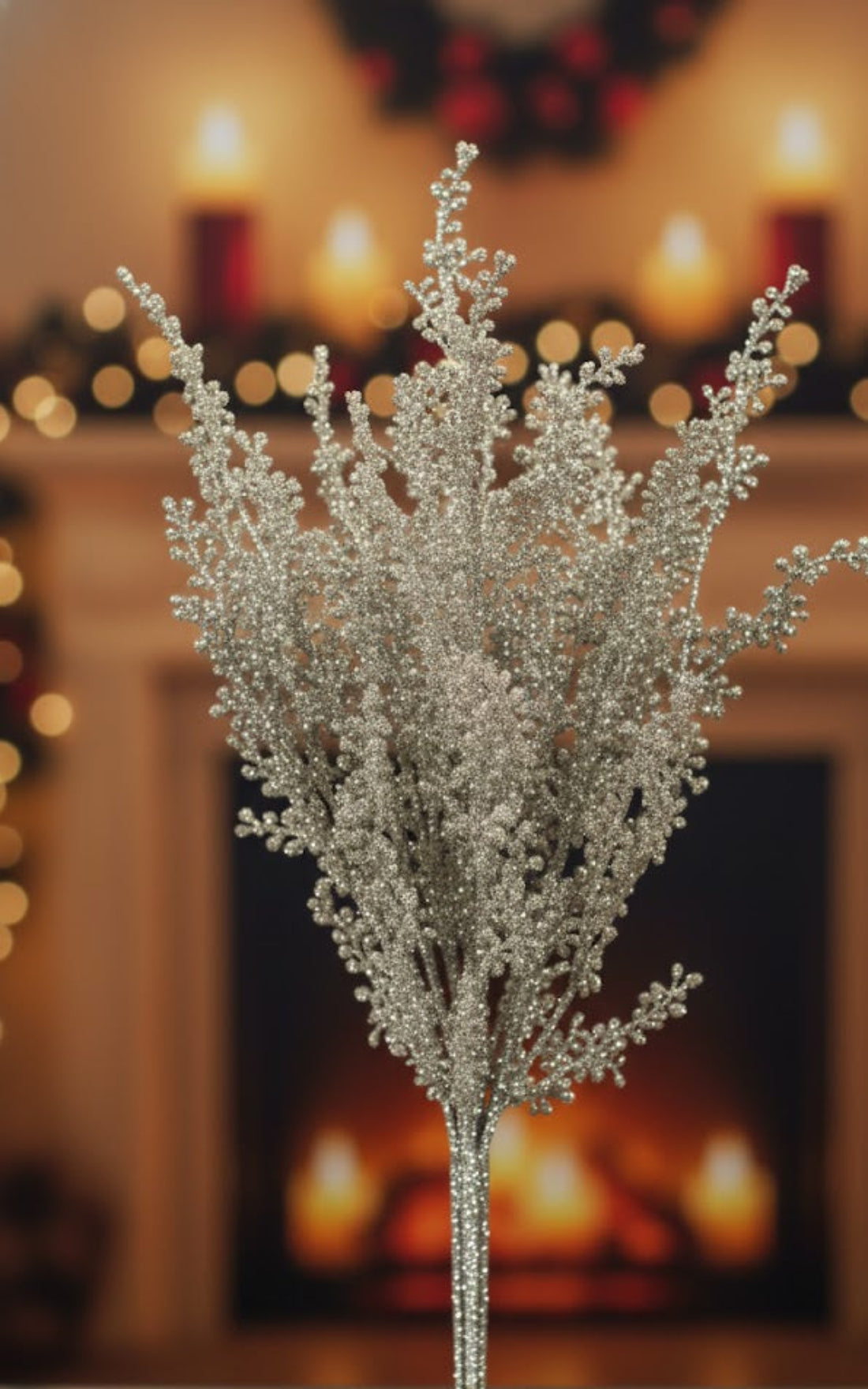 This glitter spray set includes twelve faux stems designed to add festive shimmer to seasonal décor. Each stem features silver and brown tones with glittered berry accents, creating a bright and textured look ideal for holiday arrangements. At 24 inches tall, these stems offer height and visual impact when placed in vases, added to wreaths, or styled within Christmas tree branches. Crafted from durable polyester, they maintain their shape and sparkle season after season. Their lightweight construction makes them easy to arrange individually or in groups for fuller displays. Perfect for winter decorating, event styling, or adding subtle shine to everyday arrangements.