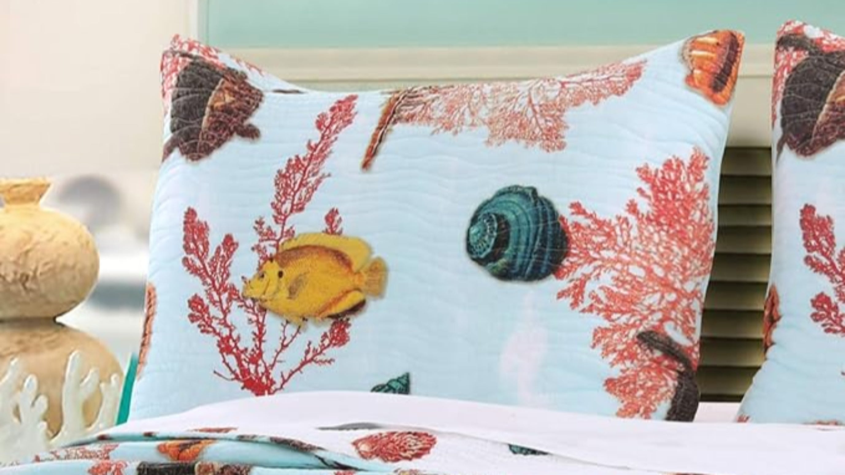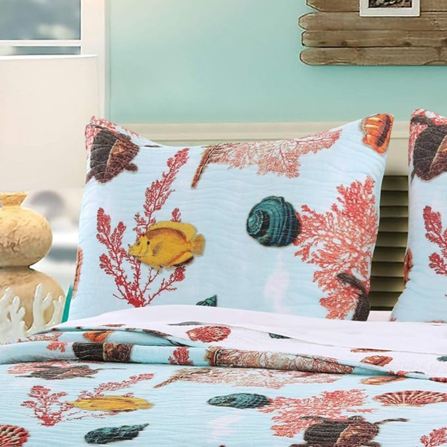 The Big Island feels like home with this ocean botanical quilt set. Tropical fish, shells and sea turtles drift among fan corals in a blue paradise. Quilt reverses to a tranquil shell print on an alabaster ground, perfect for your inner mermaid. Prewashed and preshrunk 100% cotton face and back with 100% cotton fill. Oversized for better coverage on today’s deeper mattresses. Machine quilted with fabric bound edges for durability and surface interest. Quilt set comes with quilt and two pillow shams (one sham per Twin set). Dimensions: Twin set includes one 68x88`` quilt plus one 20x26`` pillow sham, Full/Queen set includes one 90x90`` quilt plus two 20x26`` pillow shams, King set includes one 105x95`` quilt plus two 20x36`` pillow shams. Dimensions +/- 2”. Machine Wash.