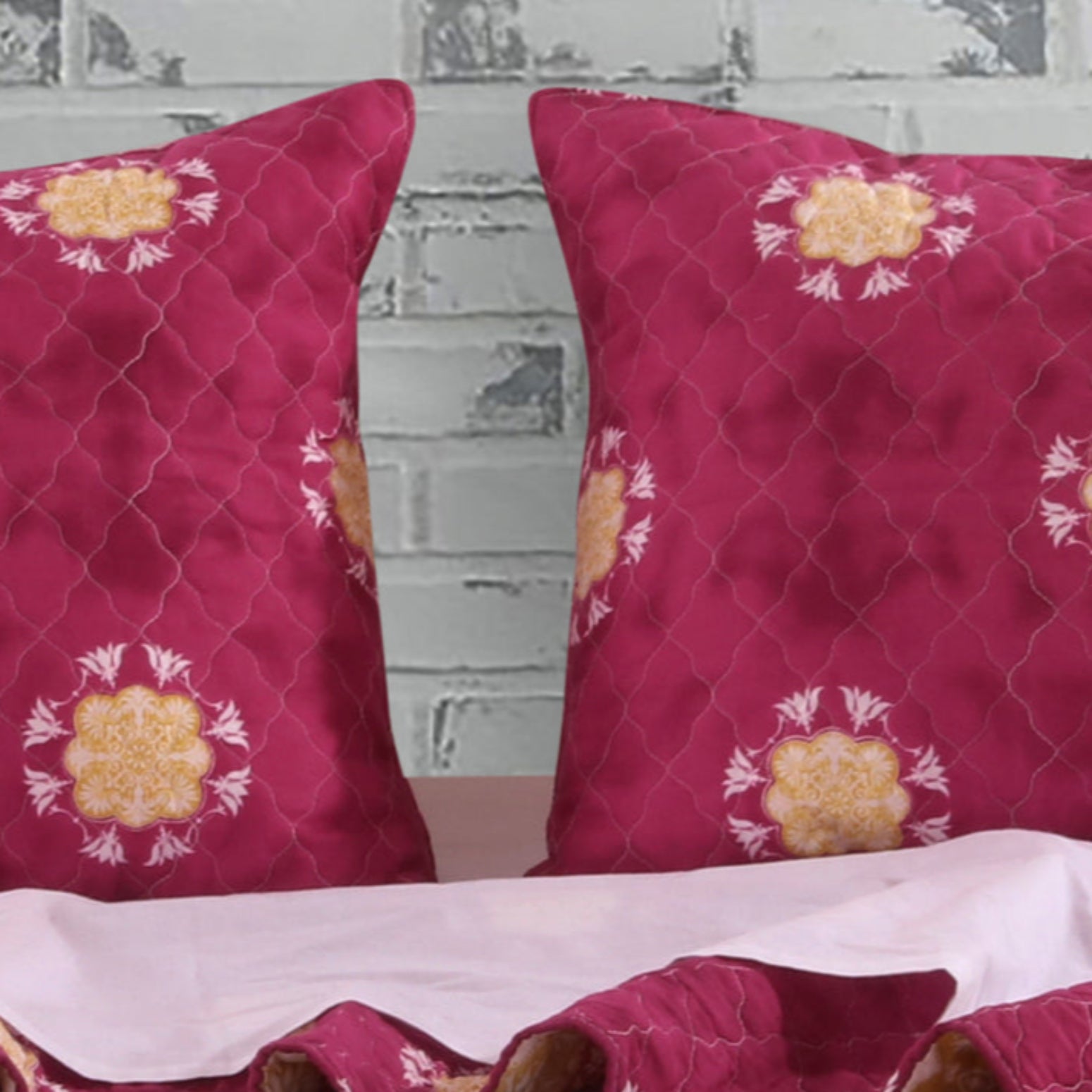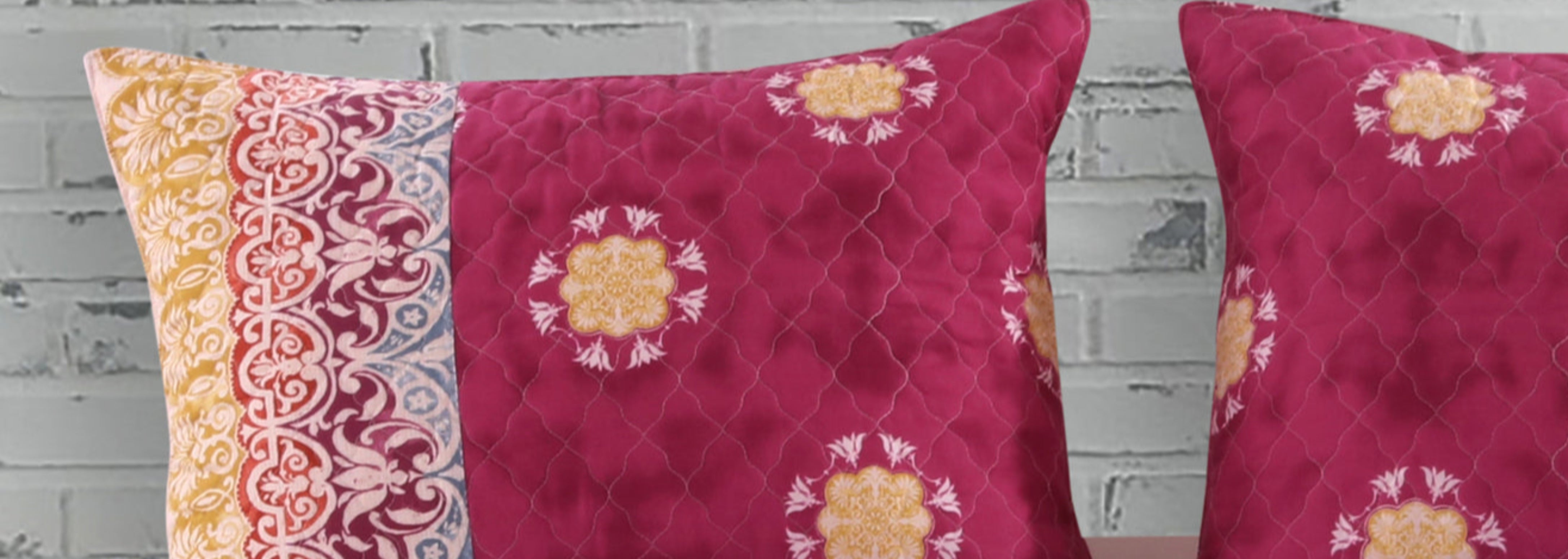 Lose yourself in a kaleidoscope of color with the Delphi quilted pillow sham. This unique pillow sham and intricate bordering details with stone-wash/tie-dye effects. Reverses to gilded medallions floating in a magenta sea. Prewashed and preshrunk. Shams are machine quilted with fabric bound edges for durability and surface interest and feature envelope opening on reverse with cloth ties for securing pillow within. Dimensions: Standard Sham 20x26``, +/- 2”, 20x36`` King Sham. Soft 100% Microfiber polyester face; 100% Moisture-wicking cotton back. Cotton rich fill (60% cotton, 40% polyester). Machine wash.