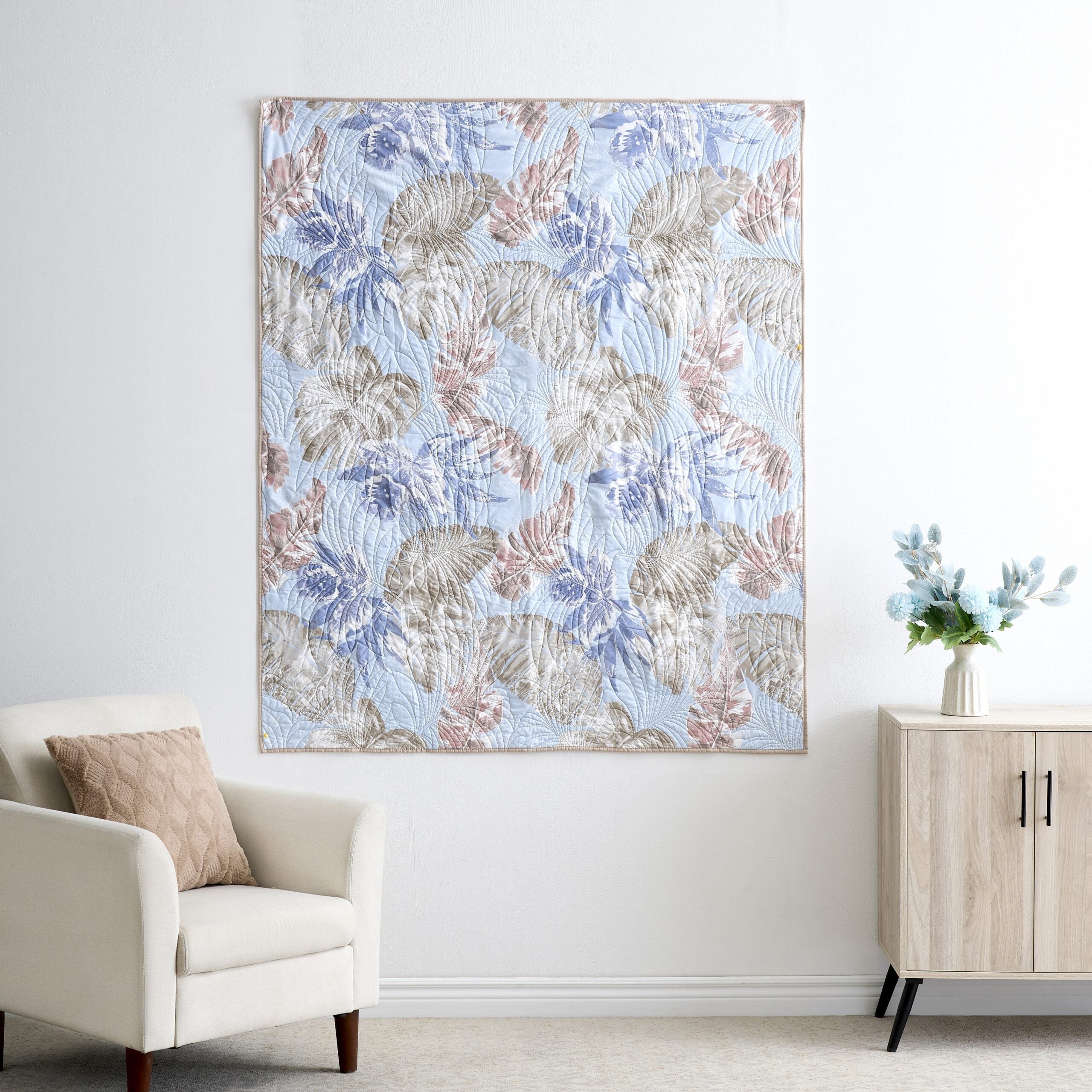 Bring tranquility to your space with the Tropics quilted throw blanket in Mist, a soothing palette of porcelain blue, sandy pink, and safari khaki on a light blue background. Tropics Mist evokes the serene beauty of a coastal retreat, creating a peaceful oasis any room. Reversing to an all-over khaki, this quilt offers versatile styling options. A palm frond stitching pattern enhances the tropical aesthetic, while the reversible design allows you to refresh your look effortlessly. Perfect for your island-themed home or beach bungalow. Also makes a great wall hanging.