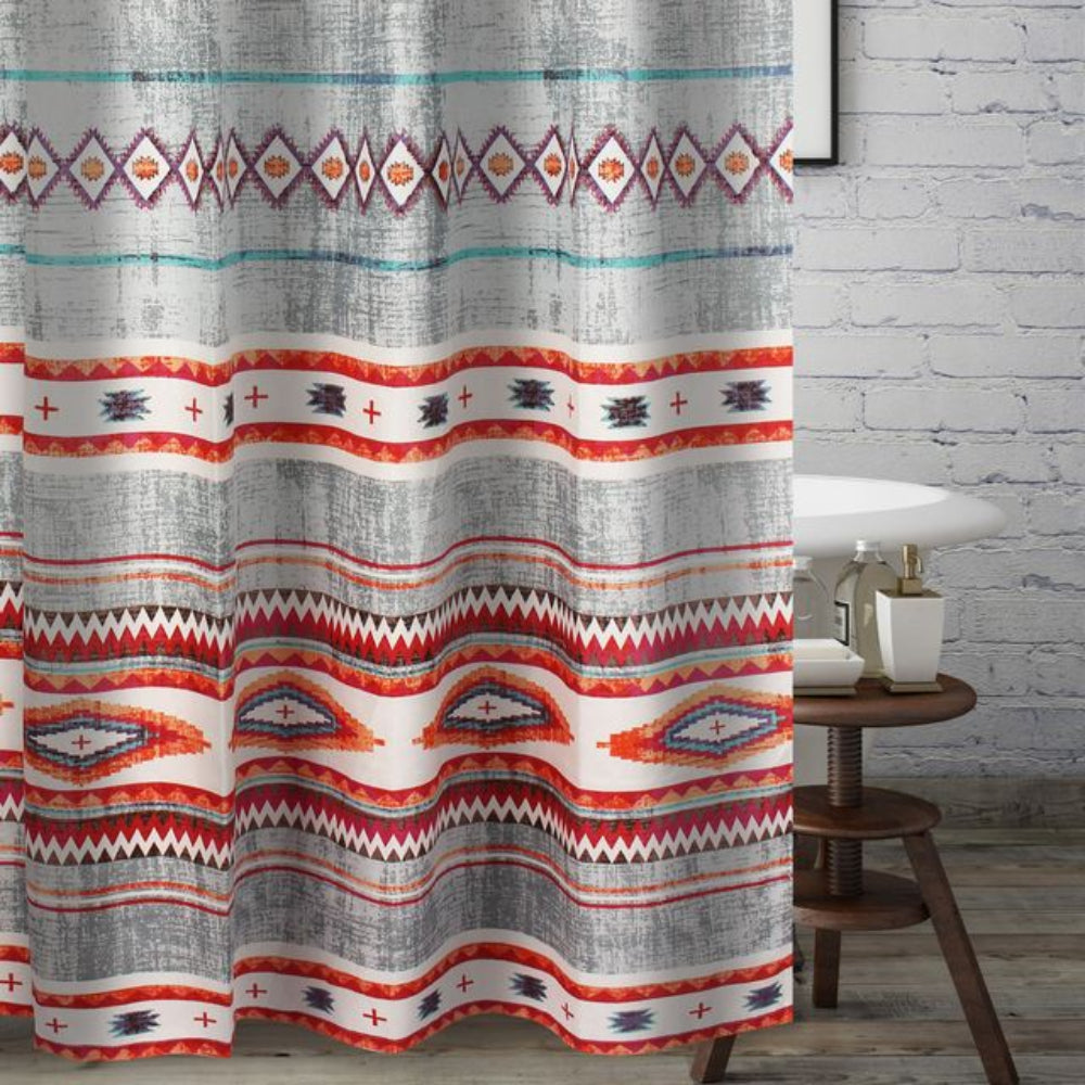 Add a vibrant, boho-inspired accent to your bathroom with the Kiva Shower Curtain by Greenland Home Fashions. Designed to fit standard shower or tub spaces, this curtain measures 72 inches by 72 inches and features reinforced buttonholes along the top for easy hanging with standard shower hooks (hardware not included). Crafted from 100% polyester, it offers a lightweight feel and dries quickly, making it perfect for high-traffic bathrooms. For best results, use with a waterproof liner (not included). The Kiva Shower Curtain is machine washable for convenient cleaning and long-lasting use. Its eye-catching design pairs beautifully with the Kiva bedding and throw collections or stands alone as a bold, artistic statement.