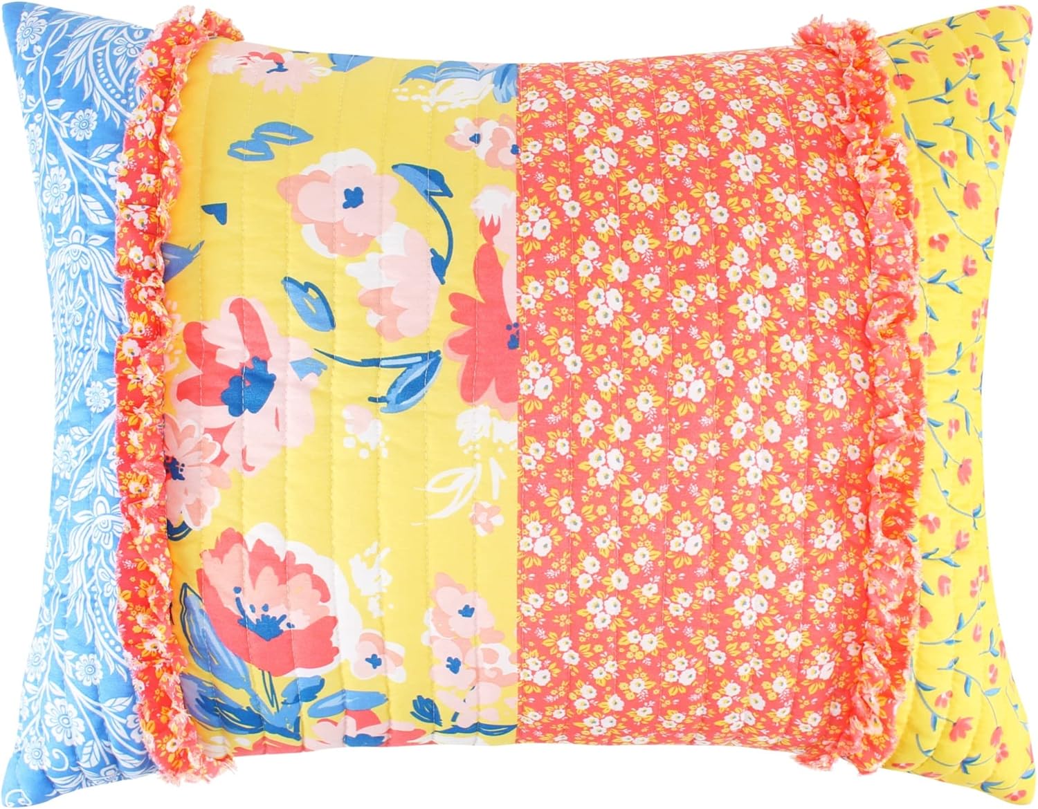 Skylar ruffled pillow shams add vintage bohemian styling with warm, bright colors. Featuring rows of ruffles, these quilted pillow shams add unique character and surface interest. Prewashed with extra softener for a silky feel. Machine quilted with fabric bound edges for durability and surface interest. Reverses to a ditsy floral calico print in white, yellow and papaya. Zipper along the side of each sham holds your pillow in place and stays out of the way so you can flip over your shams for a whole new look on your bed. Channel quilted for loft and durability. 100% microfiber face and back with 100% polyester fill. Dimensions: Standard sham measures 20x26 inches; King sham measures 20x36 inches (all dimensions +/- 1 inch). Machine Wash. Imported.