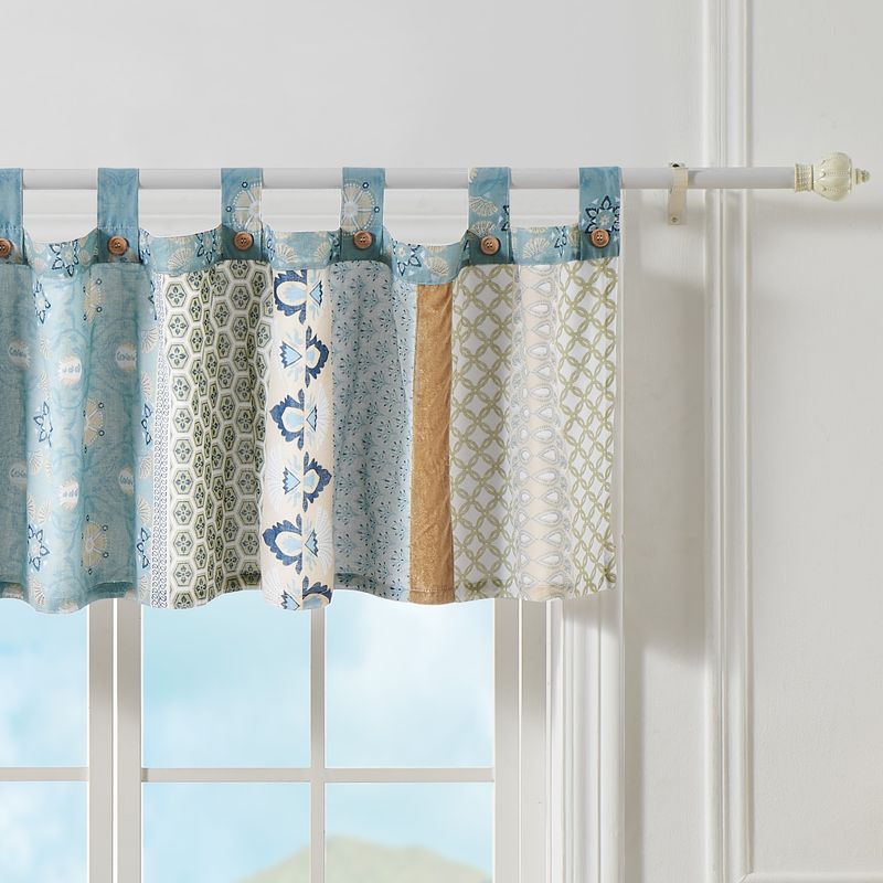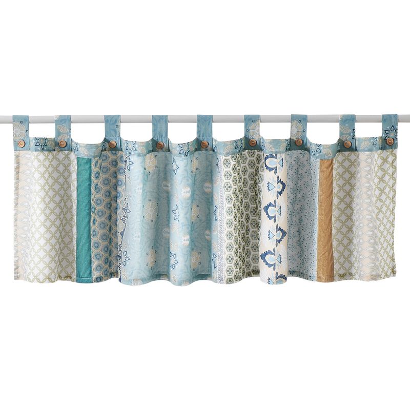 Rows of vivid geometric, foulard and floral prints create distinctive bohemian styling. The Geneva valance features the latest fashion colors and multi-fabric construction embellished with velvet bands. This multi-fabric construction tab top valance is perfect for any window. 95% Cotton 5% polyester face, 100% cotton back (2 ply). Tab tops for up to 3" rod for hanging. Dimensions: Approx. 21" long x 84" wide, including 3" tabs for hanging. Machine washable. Includes button embellishments.