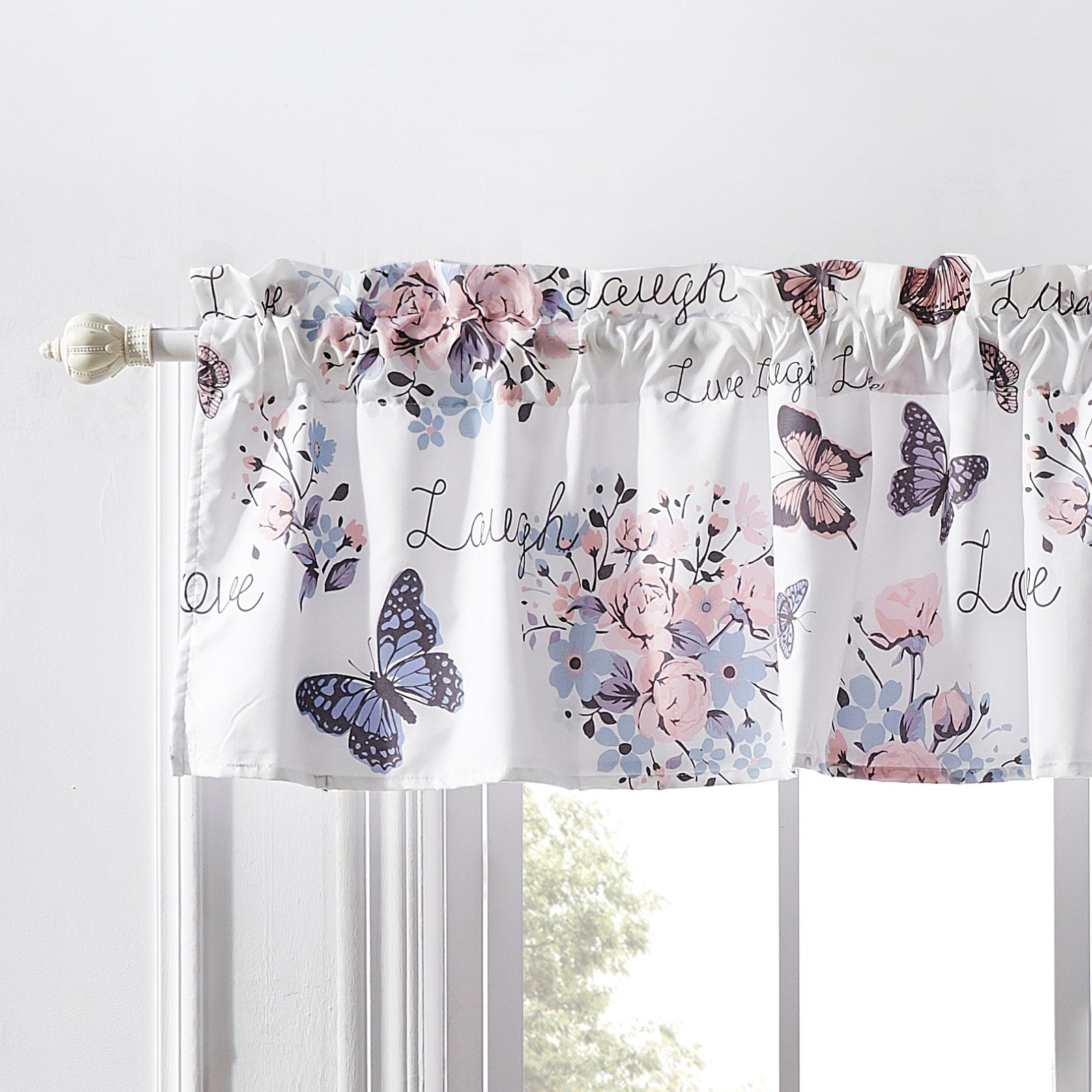 Garden Joy features pink, blue and purple flowers and butterflies on a lily white ground. As a bonus, this style includes instructions for your daily living, ``Live``, ``Love`` and ``Laugh``. A colorful reminder to be your best at home! Lined with solid color fabric for increased privacy and sun protection. Dimensions: 84 inches wide and 16 inches long, plus 2-inch header. 100% polyester face, back (2 ply). Three-inch rod pocket fits most curtain rods for hanging. Machine wash. Imported.