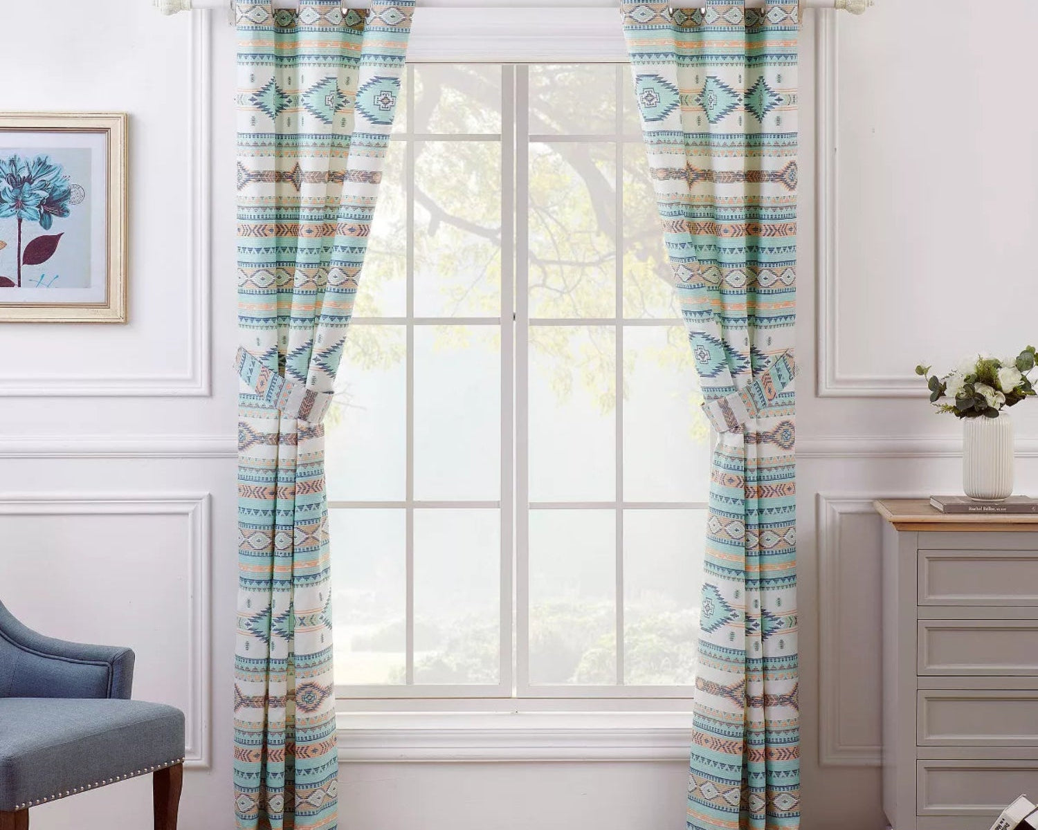 Design Theme: Southwestern geometric motifs with desert-inspired colors (ivory, turquoise, coral, blue, taupe)