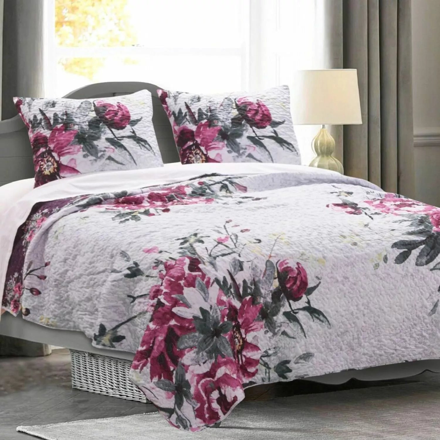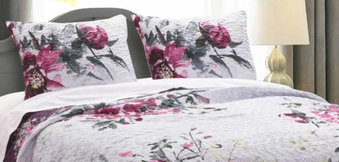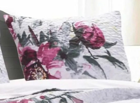 With oversized watercolor brushstroke bouquets of magenta roses on a silvery gray ground the Rose Touch bedding set adds dramatic flair to any room. Reverses to an all-over floral print in coordinate colors on a deep purple ground for two looks in one. Zipper closure to make the sham reversible and to hold your pillow in place . Machine quilted with fabric-bound edges for durability. Dimensions: Standard sham measures 20x26 inches; King sham measures 20x36 inches. 100% ultra-soft microfiber polyester face; 100% cotton back; 60% cotton 40% polyester cotton-rich fill.