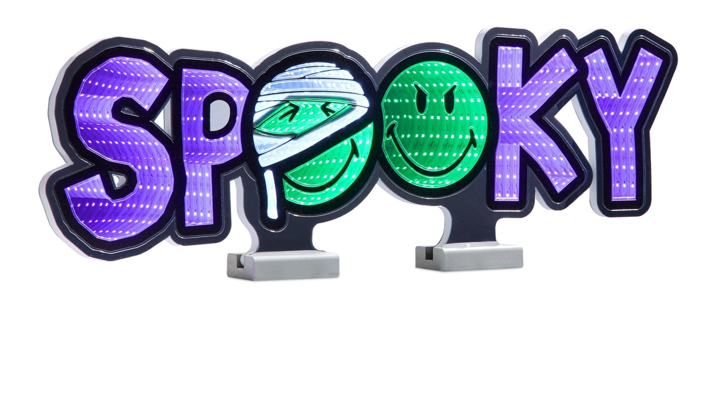 This Smiley SPOOKY Ekkolight provides a fun holiday accent for indoor spaces. Made from Acrylic, PET Plastic, and EVA Foam, it offers durable yet lightweight construction suitable for walls or narrow locations. The UL approved plug ensures consistent lighting throughout the festive season. Its slim 1 inch width allows easy placement in tight areas while the 8 inch height makes it visually prominent. Featuring purple, green, and white colors, this piece complements Halloween decor in living rooms, entryways, or offices. Dimensions: 24 inches long, 1 inch wide, and 8 inches high.