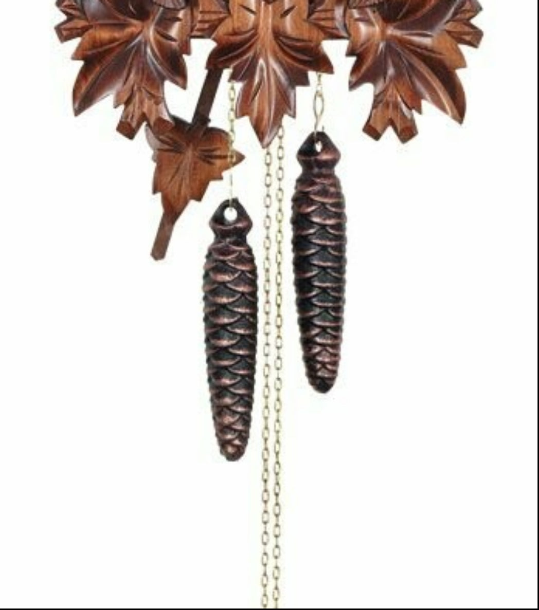 This 16-inch hand-carved Black Forest cuckoo clock features seven intricately carved maple leaves and three birds perched on the dial. Made in Germany, the clock showcases a wooden dial with Roman numerals, wooden cuckoo bird, and wooden hands. On the hour, the cuckoo bird emerges and cuckoos the time, with a single cuckoo call at the half hour. The clock is powered by a 30-hour all-brass mechanical Regula movement, wound daily using two pine cone weights. The hand-carved maple leaf pendulum ensures the clock's timing is accurate. Each clock is unique, with slight variations in color and carving that add to its charm.