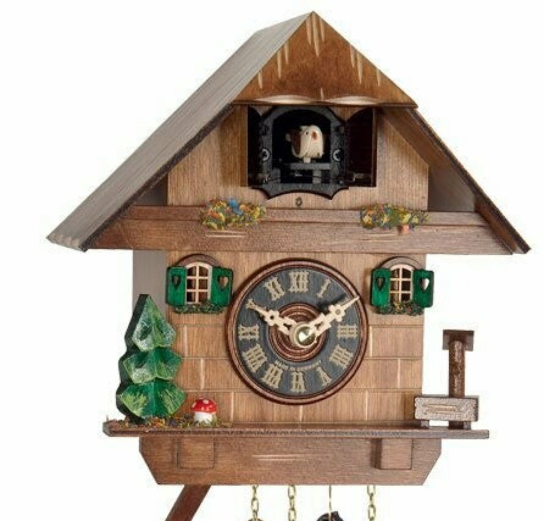 This 7-inch Black Forest cuckoo clock features a charming cottage with a tree, mushroom, and a functional water pump at its base. On the hour, the cuckoo bird announces the time, while the half hour is marked with a single cuckoo call. A manual night shut-off switch allows you to mute the cuckoo sound. The clock is powered by a 30-hour all-brass mechanical Regula movement and wound daily with two cast iron pine cone weights. The hand-made pendulum swings continuously to regulate time. Each clock is uniquely handcrafted, with slight variations in carving and coloration, making it a one-of-a-kind piece for any home.