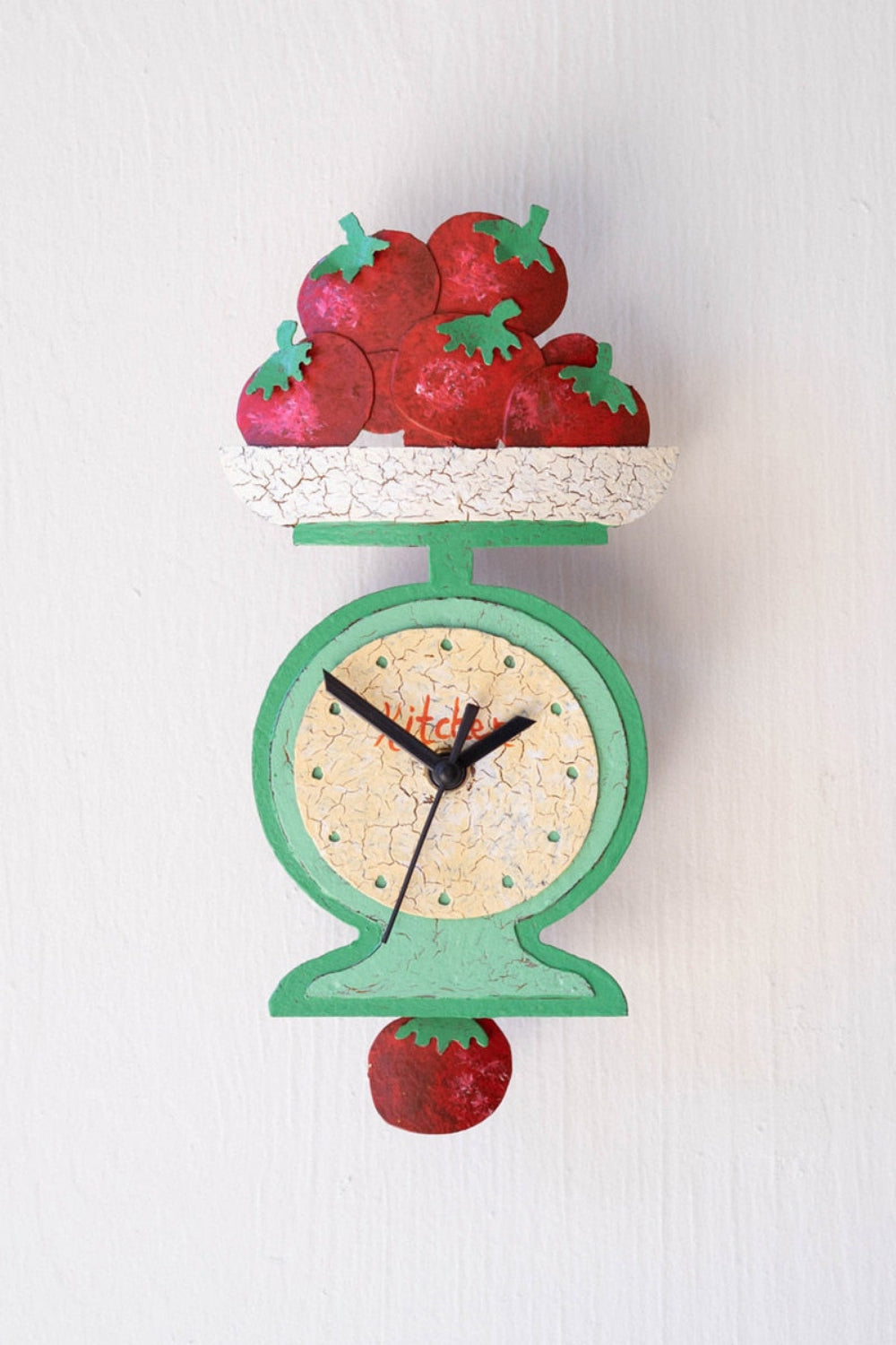 - Hand-painted wall clock with tomatoes and vintage scale design