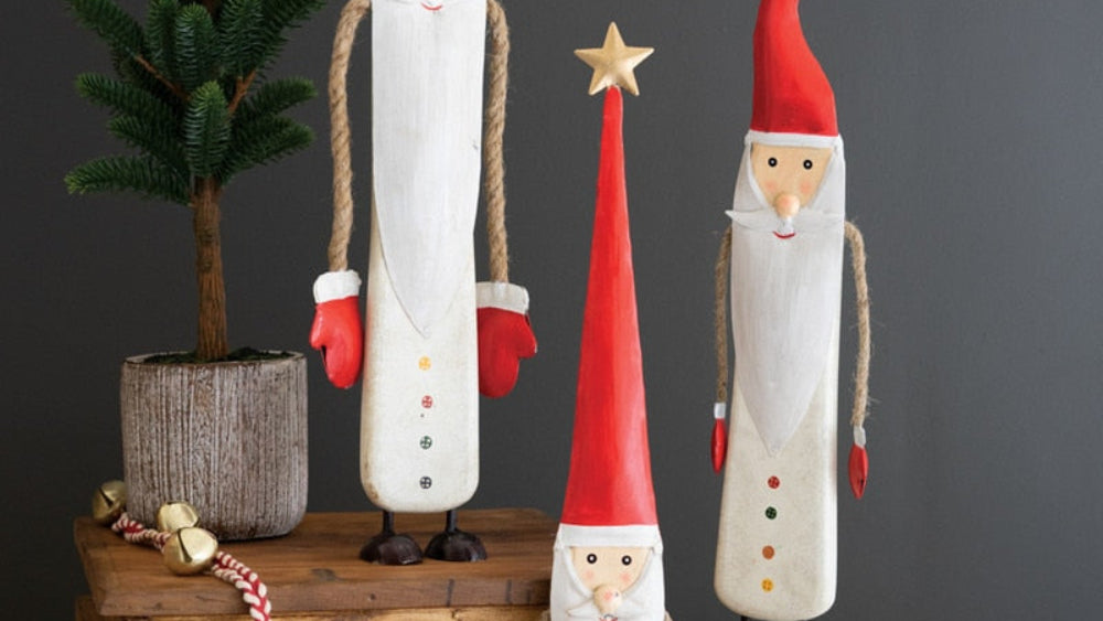 Bring festive cheer to your holiday decor with the Set of Three Painted Metal and Wood Santa's with Rope Arms by Kalalou. These handcrafted Santa's feature durable painted metal bodies and wood accents, with flexible rope arms for playful positioning and interactive displays. The set includes three sizes—large (5" x 2" x 18.5"t), medium (4.5" x 2" x 18"t), and small (4" x 2" x 17.5"t)—allowing for layered arrangements on mantels, tables, or shelves. Each Santa showcases detailed painted attire and expressive faces, adding charm to any holiday setting. Lightweight yet sturdy, these Santa's are perfect for rustic, farmhouse, or traditional decor and make a delightful seasonal gift.