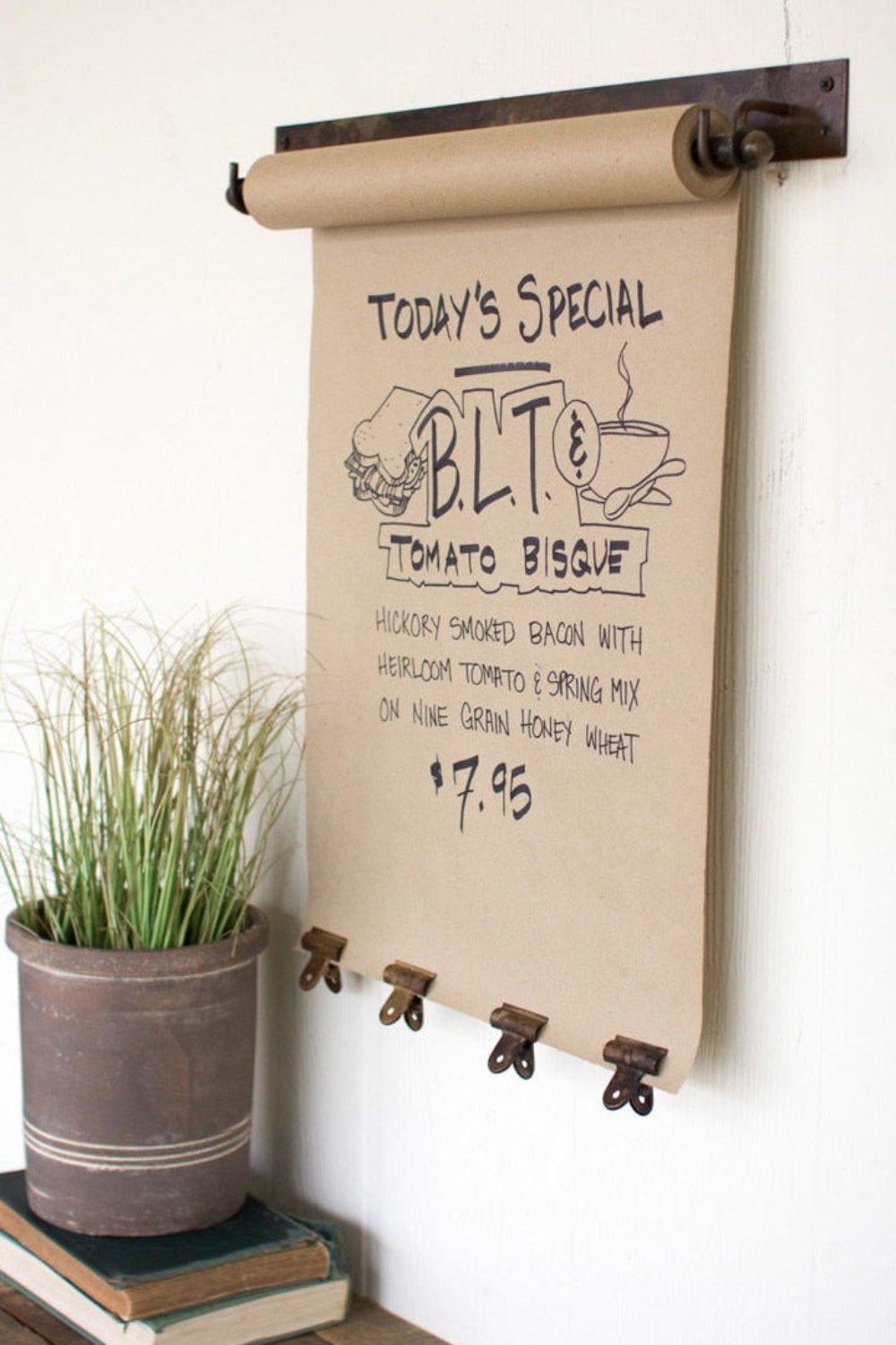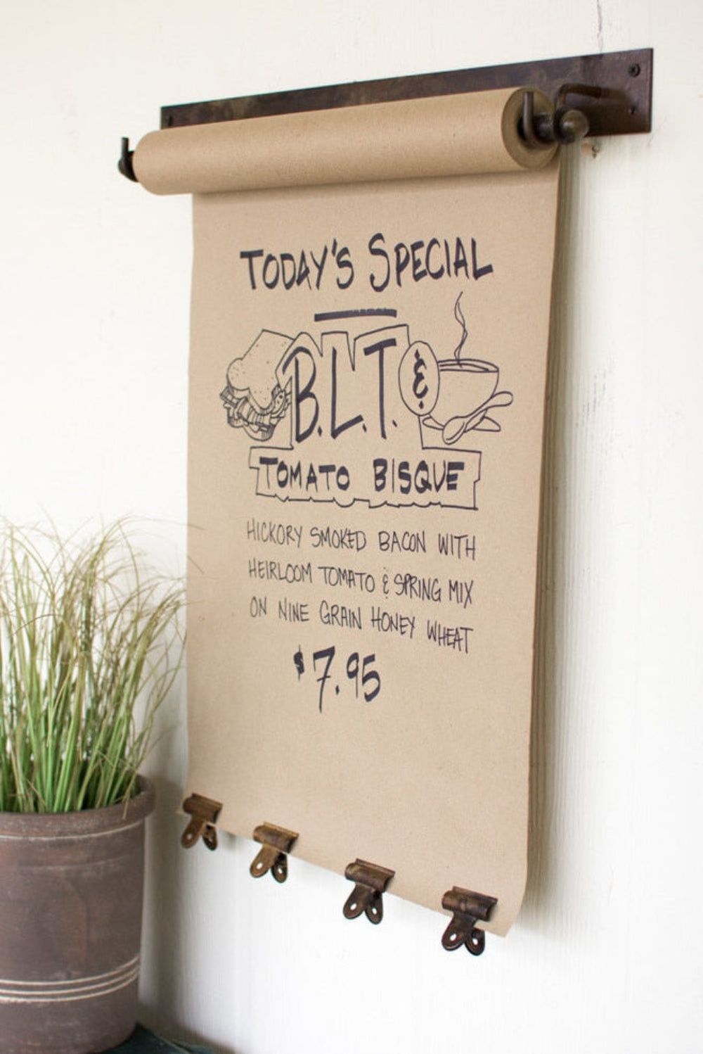 Bring functional creativity to your walls with the Hanging Note Roll with 4 Brass Finish Clips (Set of 2) by Kalalou. Perfect for homes, restaurants, or studios, this versatile wall décor set lets you jot down reminders, display menus, or spark imagination. Crafted from durable metal with a warm brass finish and fitted for a 16" replacement note roll, it blends style and practicality effortlessly. A wonderful way to stay organized while adding a rustic-industrial touch to any space.