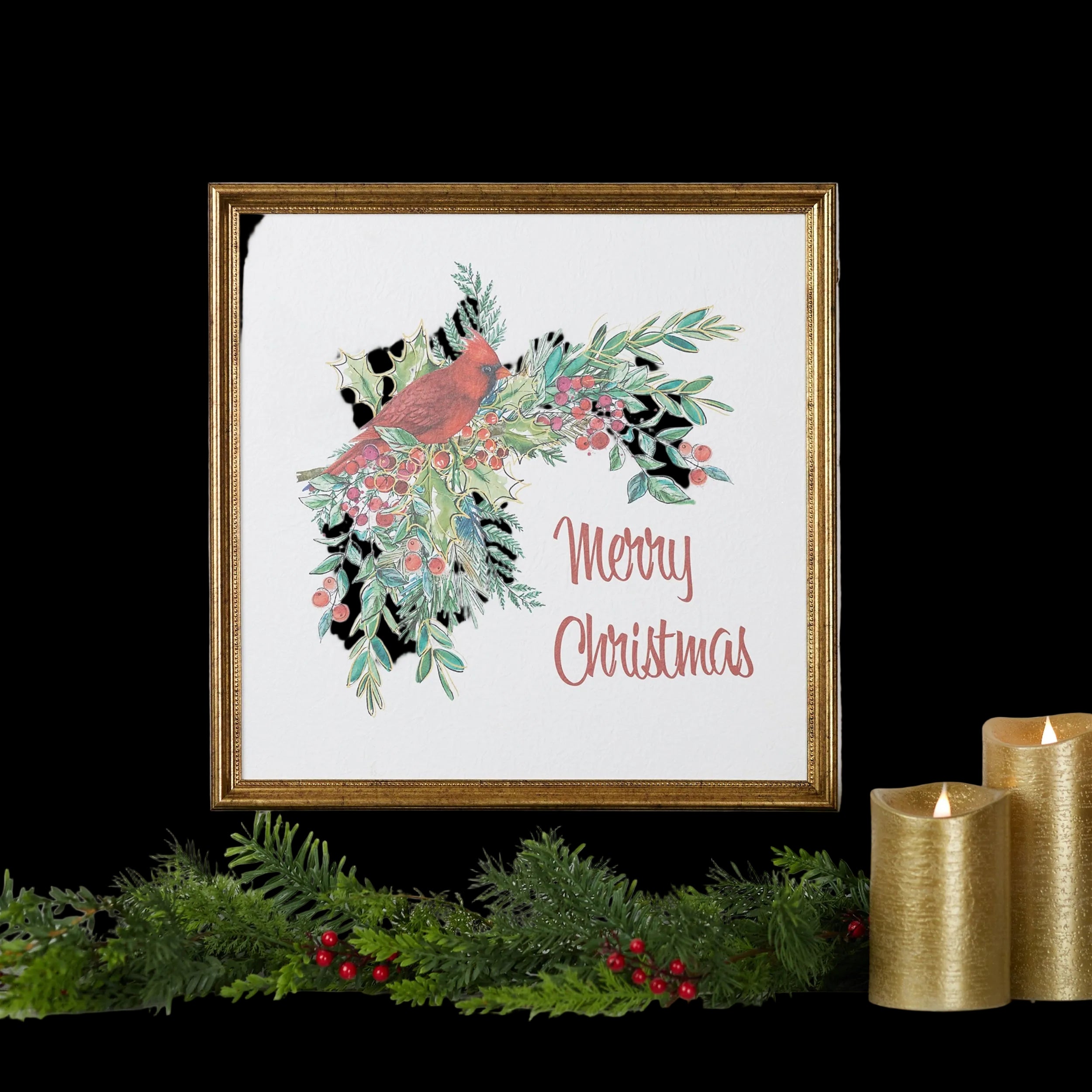 Bring festive charm to your home with this Merry Christmas Cardinal Framed Wall Art. Crafted from durable MDF wood, paper, and plastic, this square décor piece measures 16" L x 0.75" W x 16" H and features a beautiful watercolor-style cardinal perched on winter greenery with bright berries. Finished with an elegant gold-tone frame, this artwork adds warmth and holiday spirit to living rooms, kitchens, cabins, and seasonal wall displays.