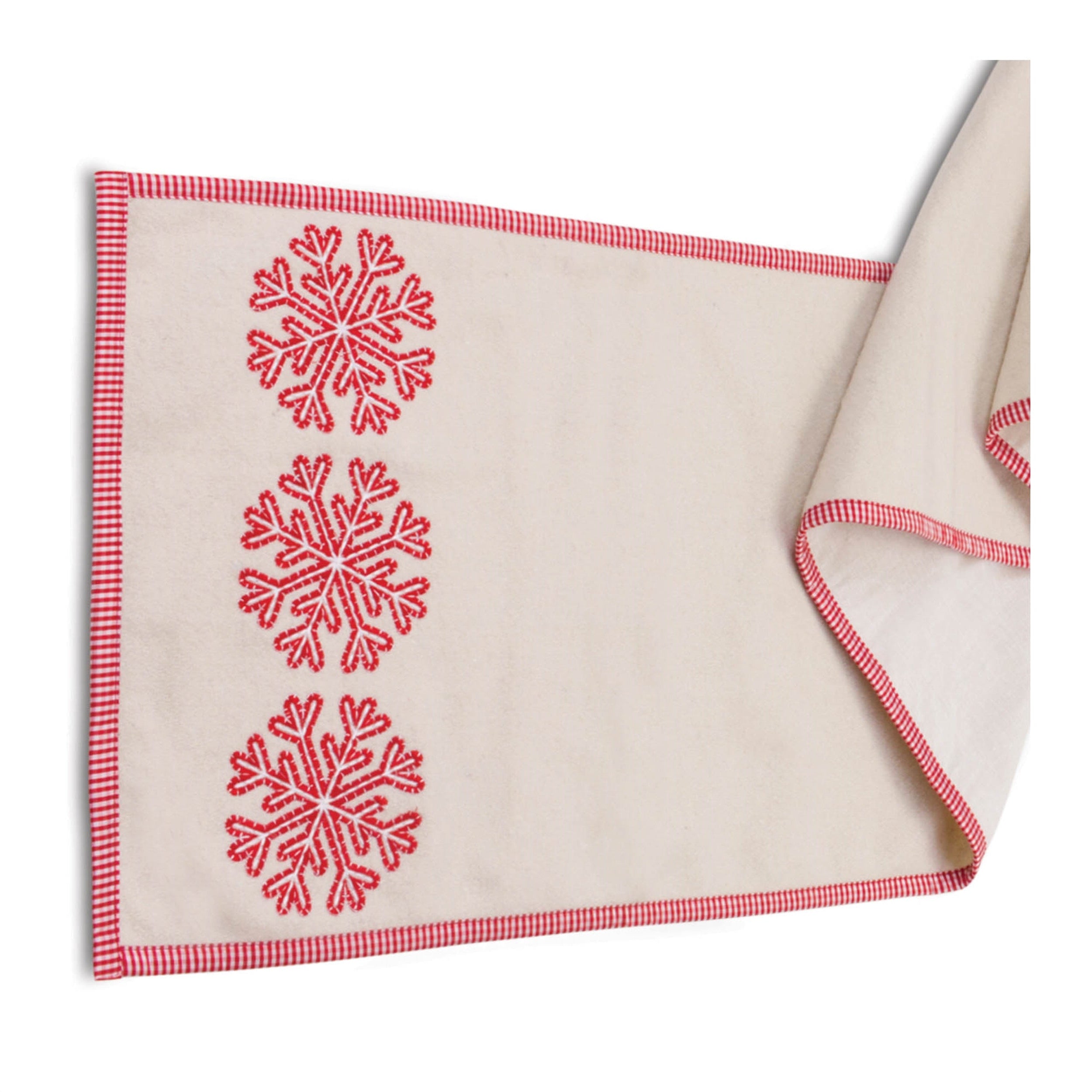 This polyester table runner features an embroidered snowflake design crafted in cream and red tones, adding a warm seasonal look to holiday dining spaces. Measuring 72 inches long, 14 inches wide, and 0.25 inches high, it fits most standard dining tables and provides a clean, decorative accent for festive gatherings. The durable polyester construction offers long lasting use and easy maintenance throughout the season. Designed for indoor settings, this runner brings a traditional holiday feel that works well with a variety of tableware styles. Its embroidered details and classic color palette make it an ideal choice for creating a welcoming and coordinated holiday table display.
