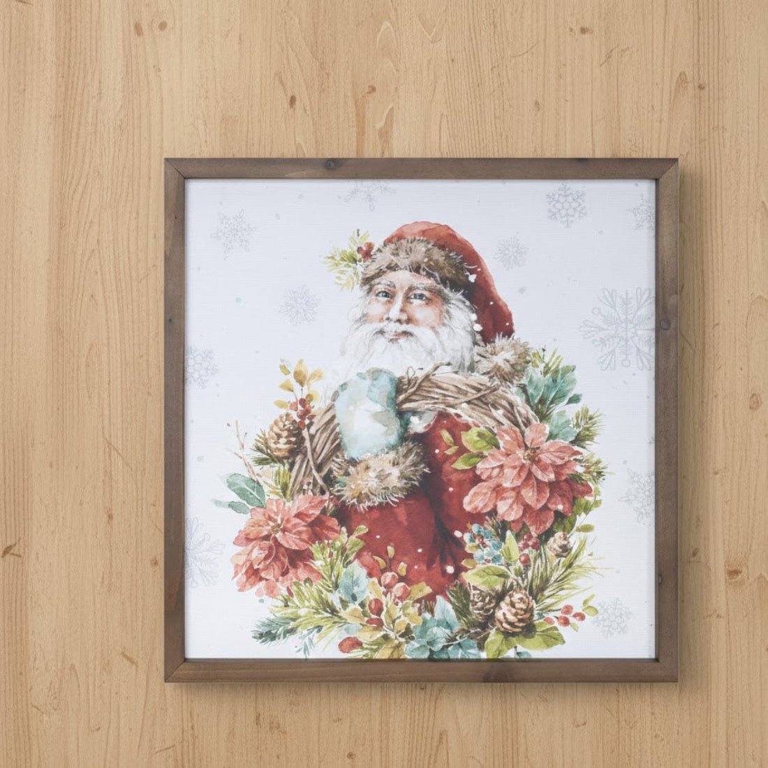 This Christmas wall décor features a Santa print framed in MDF and fir wood for a warm, seasonal look. The watercolor-style artwork shows Santa surrounded by winter florals, pine greenery, berries, and poinsettias against a soft snowflake background. Finished with a rustic wood grain frame, this square wall piece includes a sawtooth hanger for easy mounting. Ideal for living rooms, entryways, or holiday displays, it adds a classic festive touch to seasonal interiors.