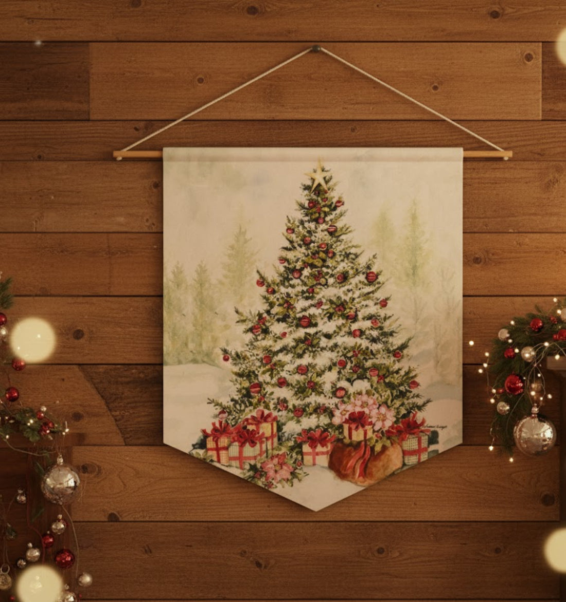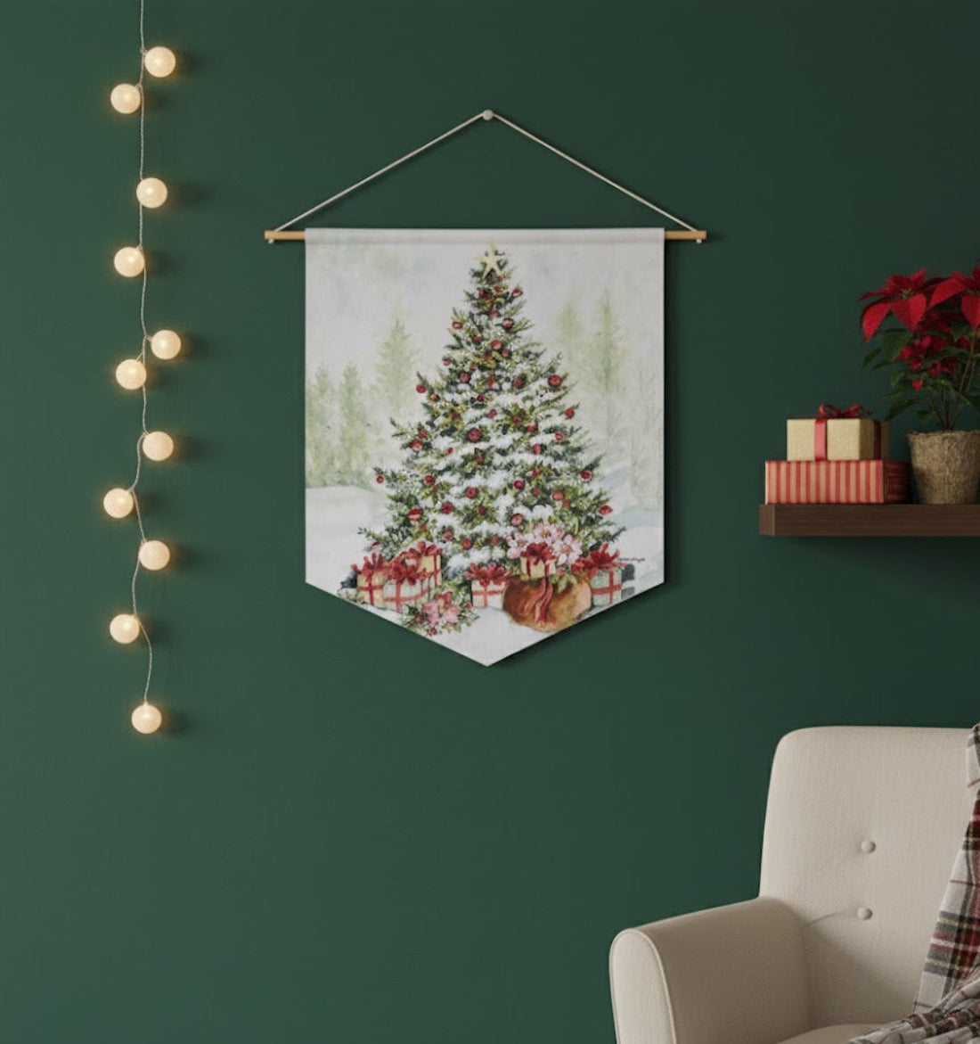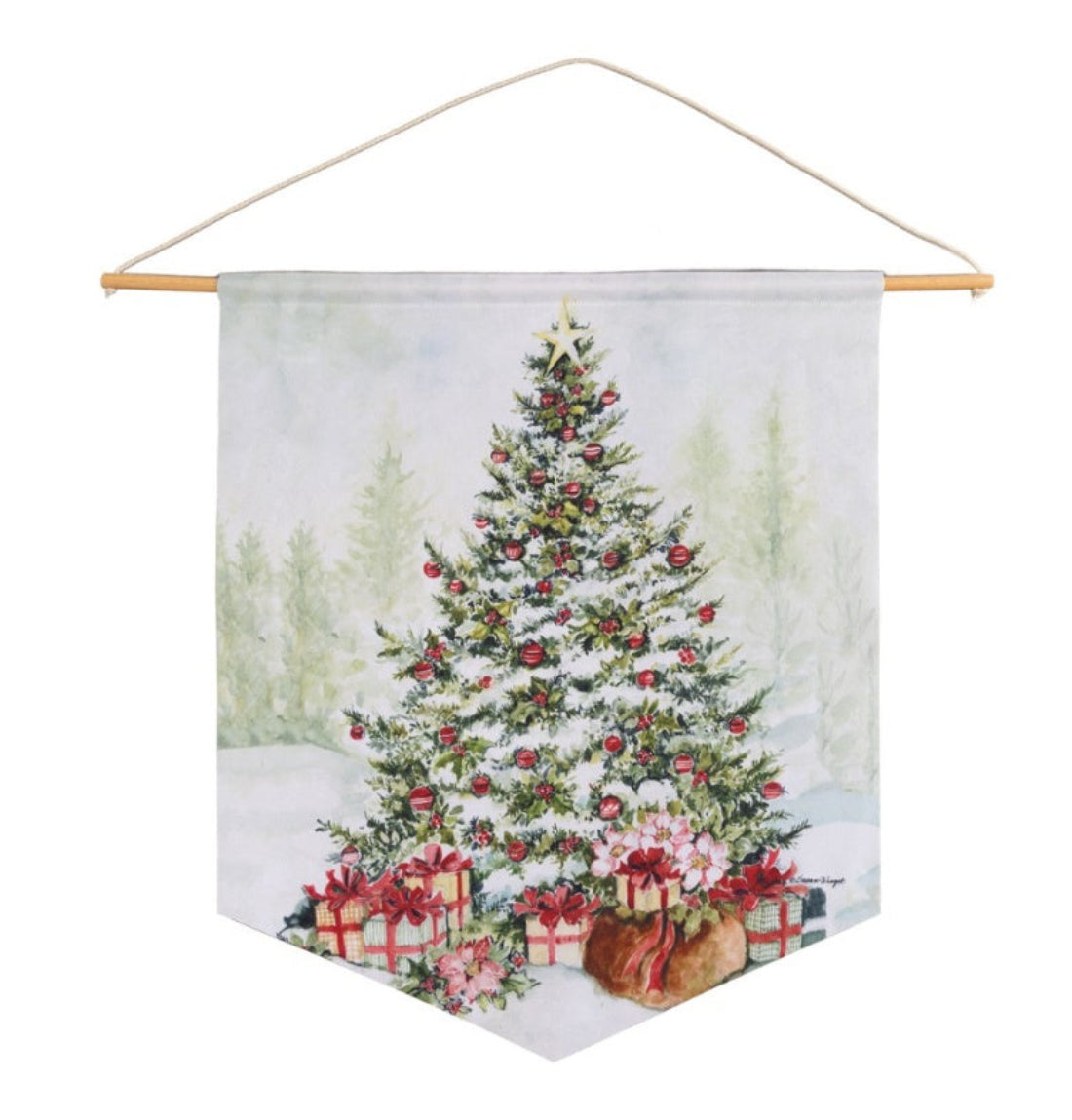 This festive pennant features a classic Christmas tree surrounded by vibrant poinsettias, part of the Holly and Pine collection. Made from 100% polyester, the 16"x20" pennant adds a cheerful and seasonal accent to your holiday décor. Its durable fabric and vivid print make it ideal for indoor use, bringing a traditional holiday spirit to walls, windows, or mantels. Easily incorporate this timeless design to enhance the festive atmosphere of your home.