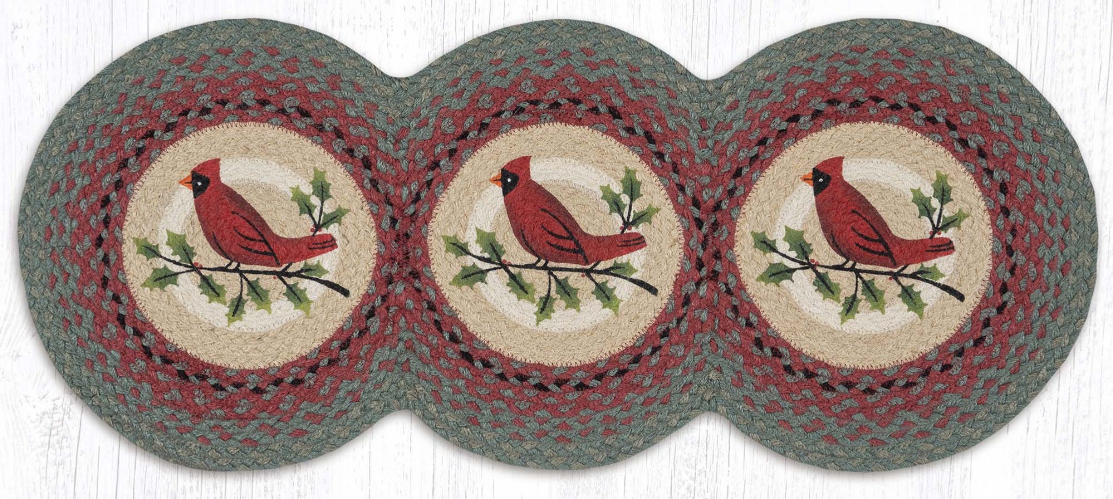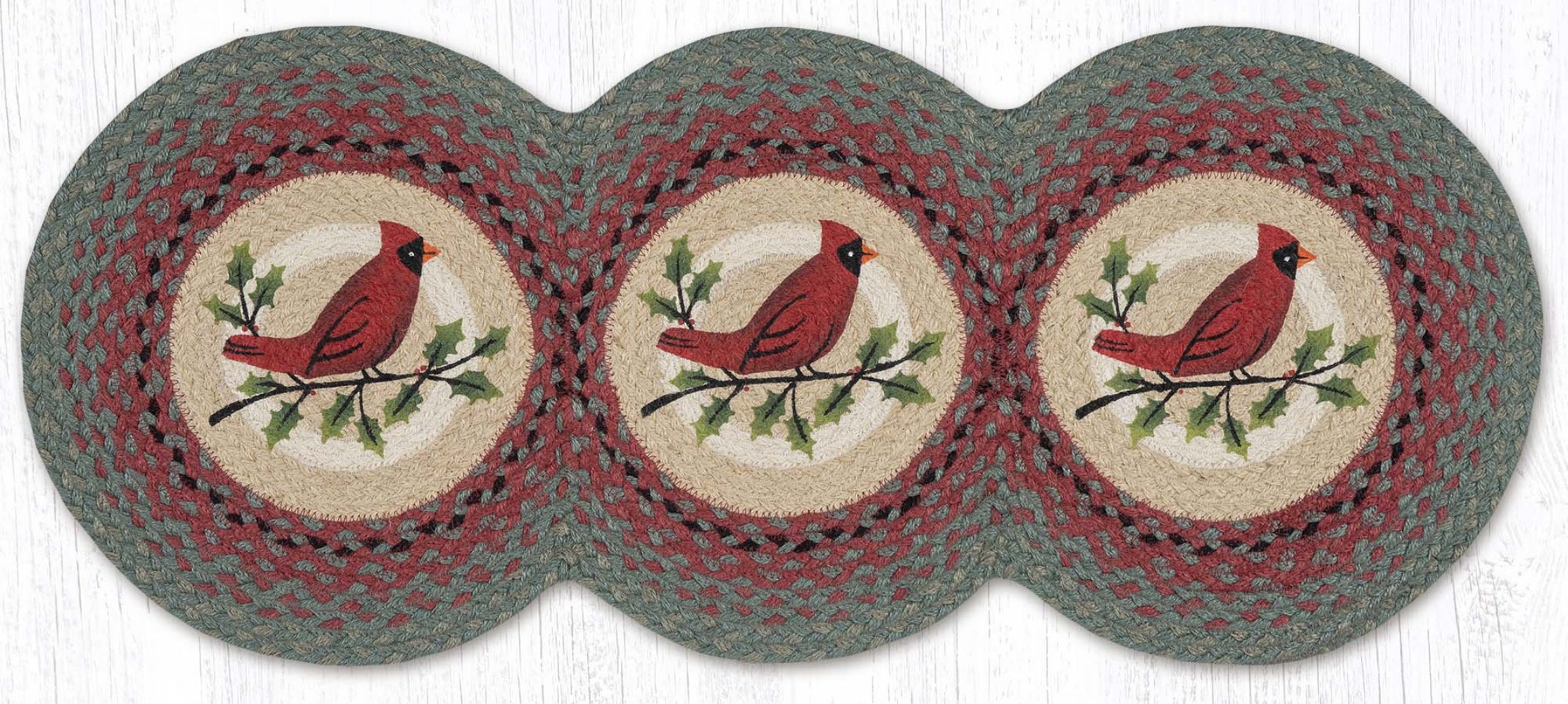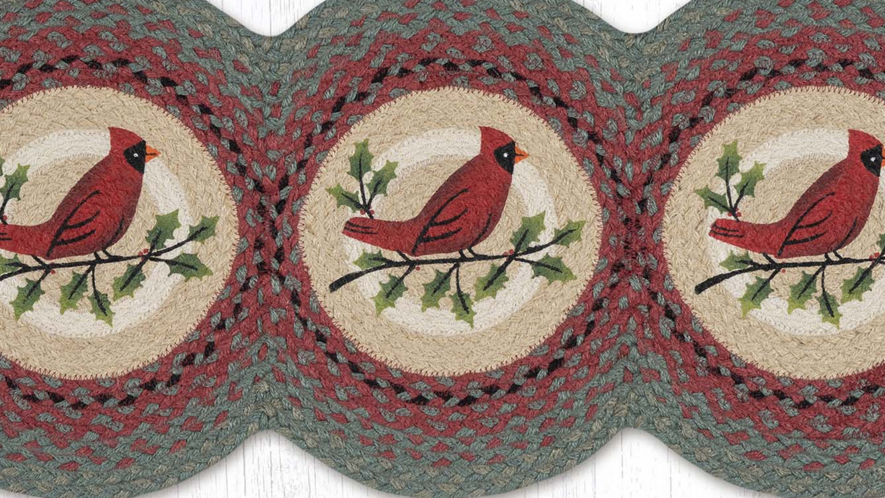 Holly Cardinal Printed Tri Circle Runner 15" x 36" – Natural Jute Braided Table Runner