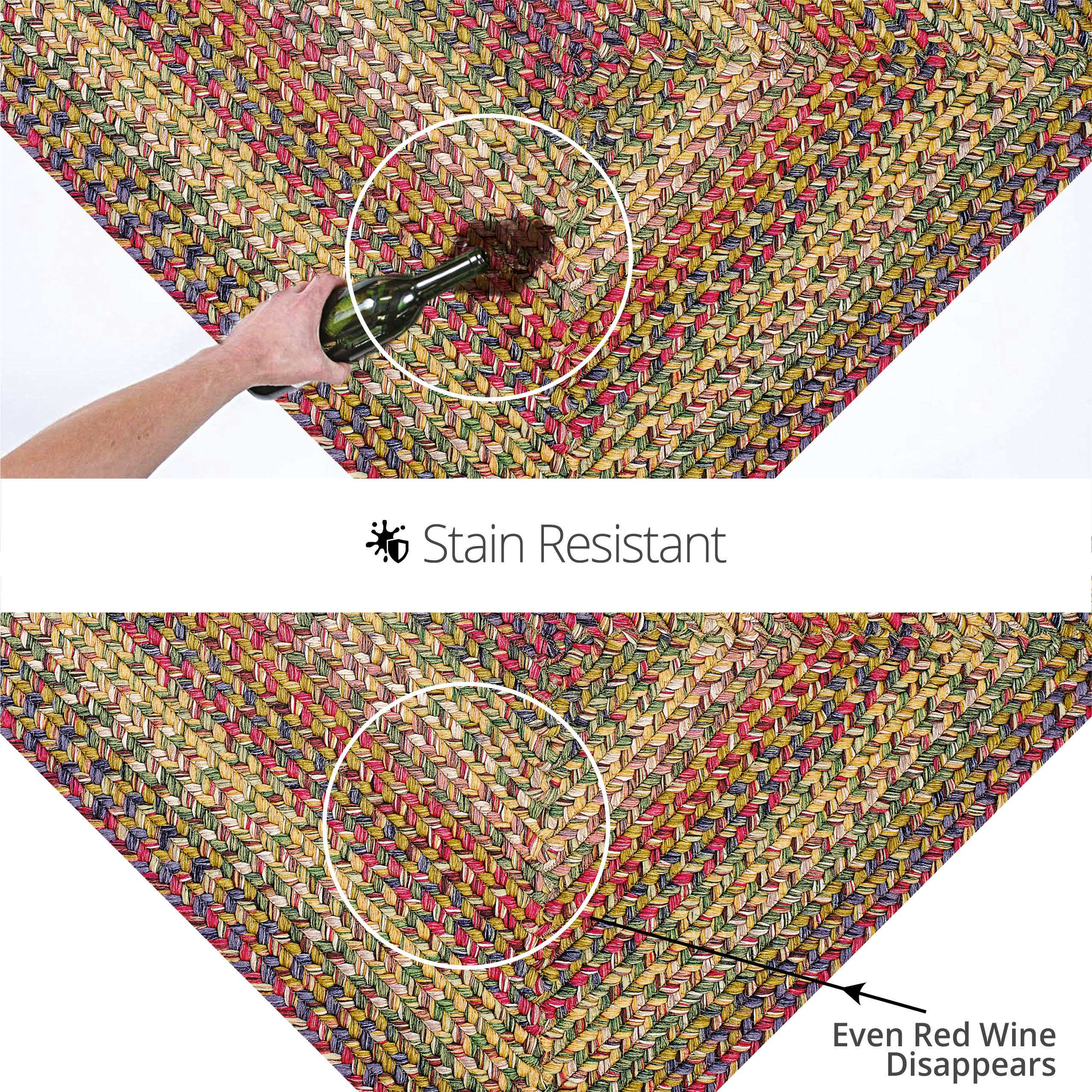 - RAINFOREST ULTRA DURABLE BRAIDED RUG: Lush greens, cool slate grey, vibrant burgundy and tropical tan invoke images of a zen-like paradise. Treated for superior UV resistance for use under direct sunlight Treated for superior UV resistance for use under direct sunlight