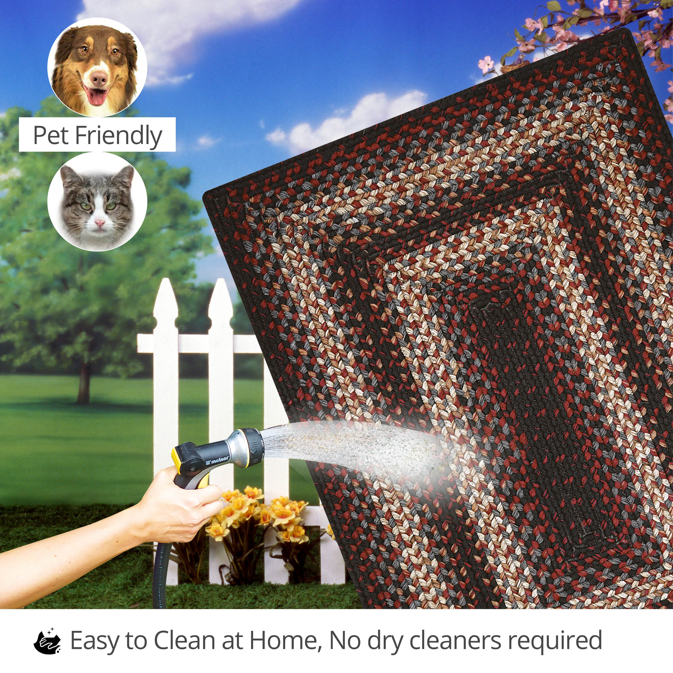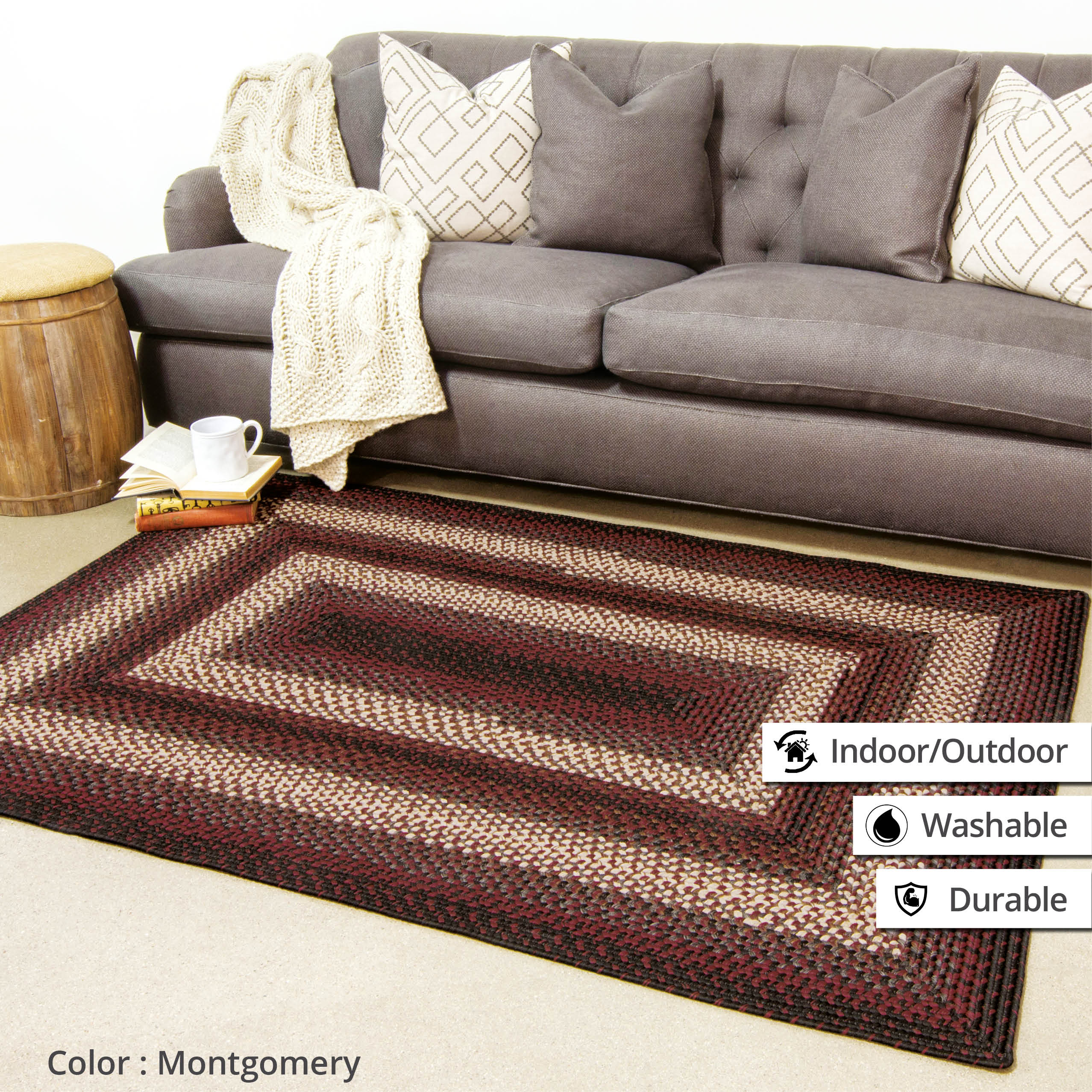 • MONTGOMERY ULTRA DURABLE BRAIDED RUG: Montgomery is a stunning combination of black, burgundy, grey, brown, and cream. Treated for superior UV resistance for use under direct sunlight