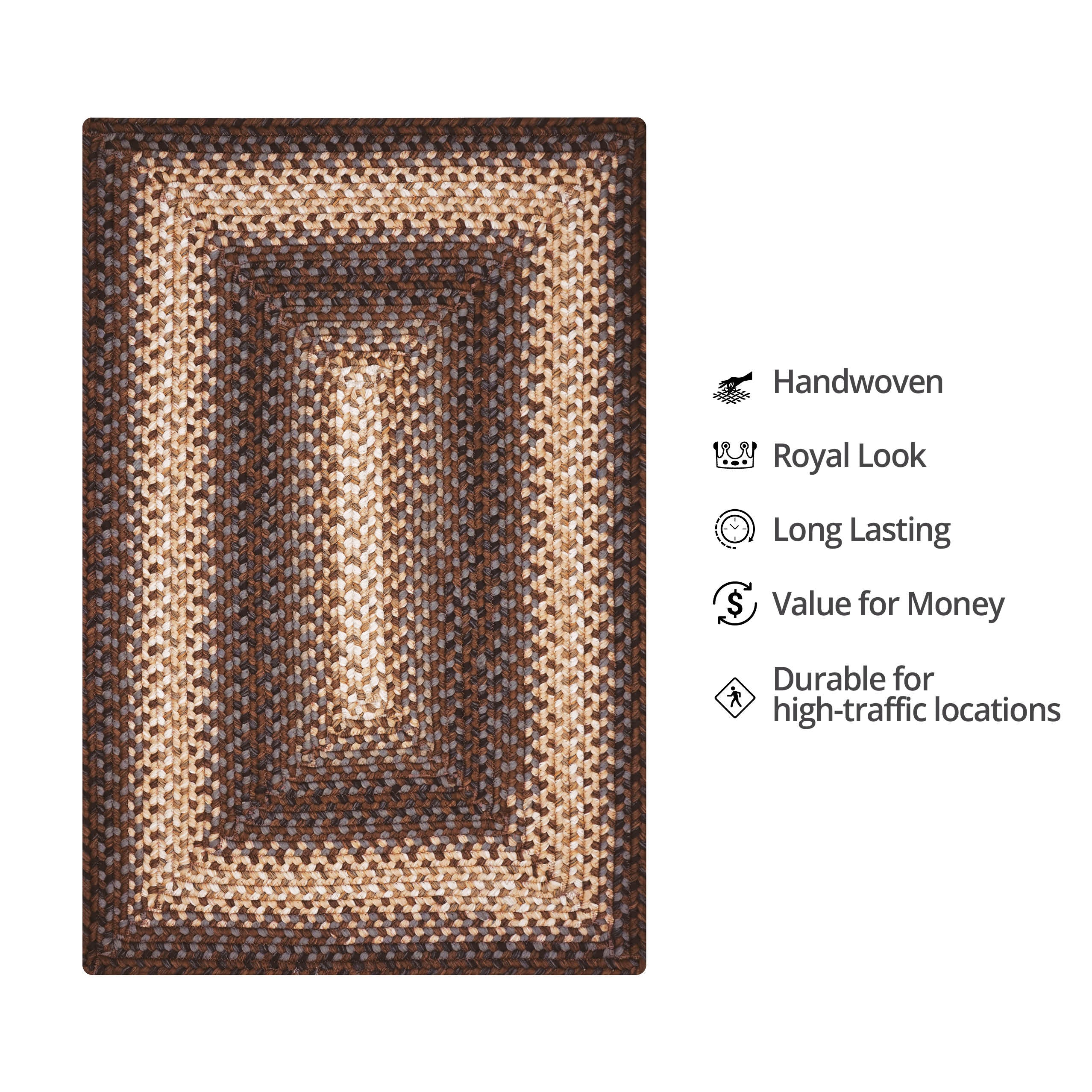 A warm, rich combination of black, brown and gray, softened with cream, makes a simple yet stunning statement. Ultra Durable braided rugs are the most versatile and dependable rugs. Made from our exclusive high-performance Ultra Durable yarn, this collection is washable, indoor/outdoor-friendly, mold and mildew-resistant, ideal for active families, and spill-proof. Our customers' favorite rugs, these classic designs are made exclusively by Homespice. These rugs are easy to care for - just hose them clean! Homespice is a family-owned company that is committed to producing high-quality, handcrafted, unique products, and providing excellent customer service. CHARACTERISTICS: Slight irregularities such as minor size, dye lot, and pattern variations are inherent to all handcrafted products