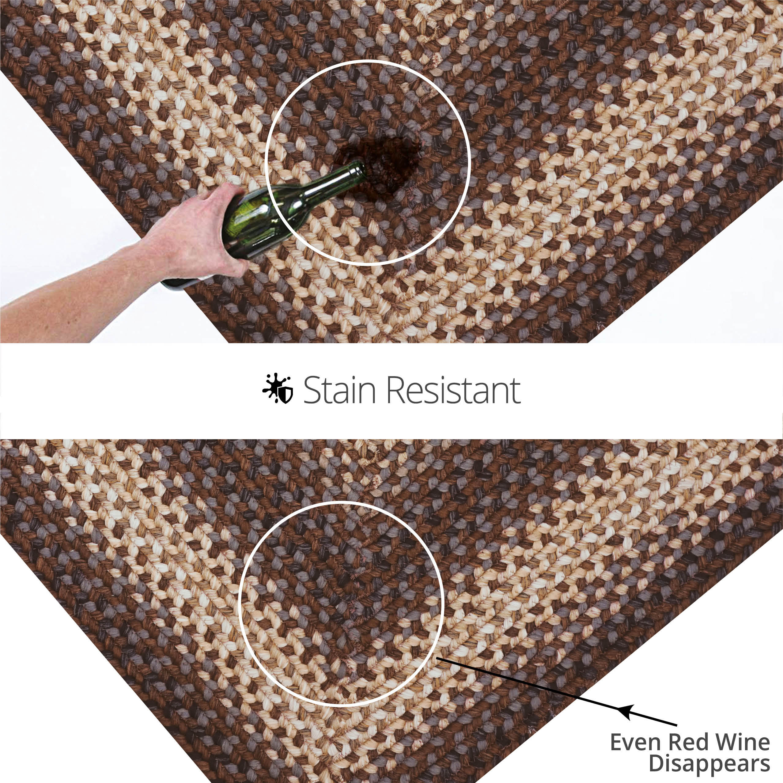 - DRIFTWOOD ULTRA DURABLE BRAIDED RUG: A warm, rich combination of black, brown and gray, softened with cream, makes a simple yet stunning statement. Treated for superior UV resistance for use under direct sunlight