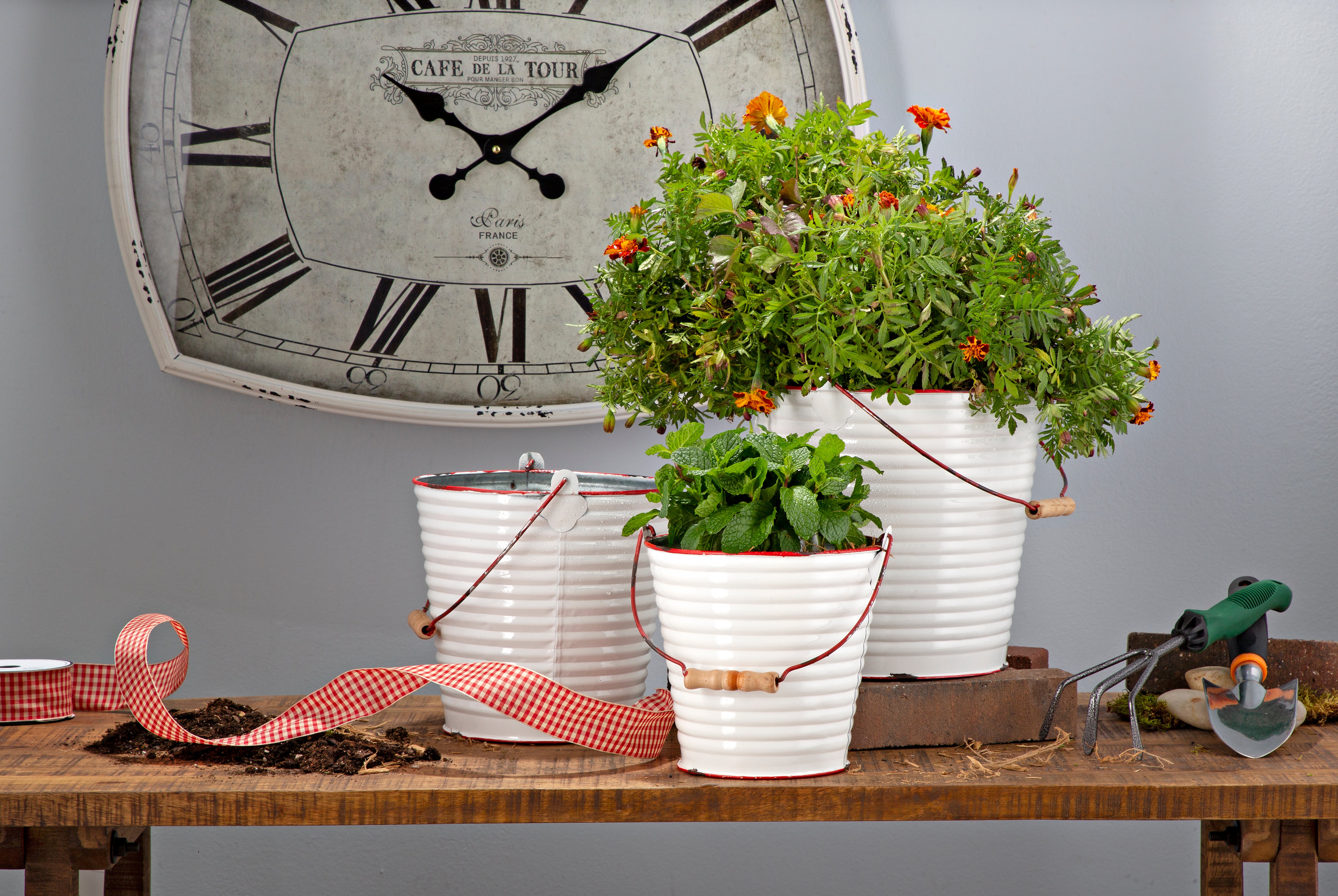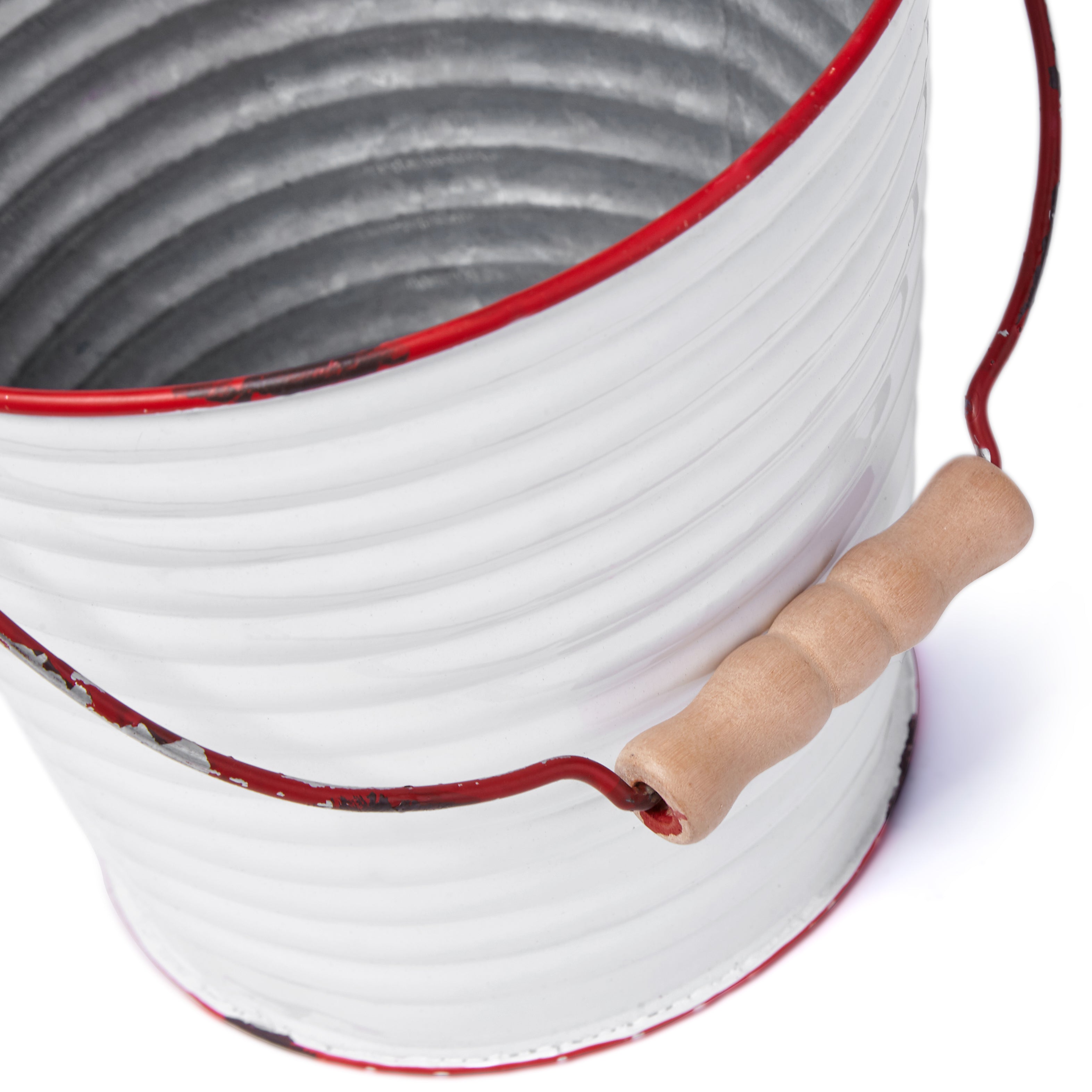 - Assortment of rustic enamel buckets with wooden handles are decorative and functional