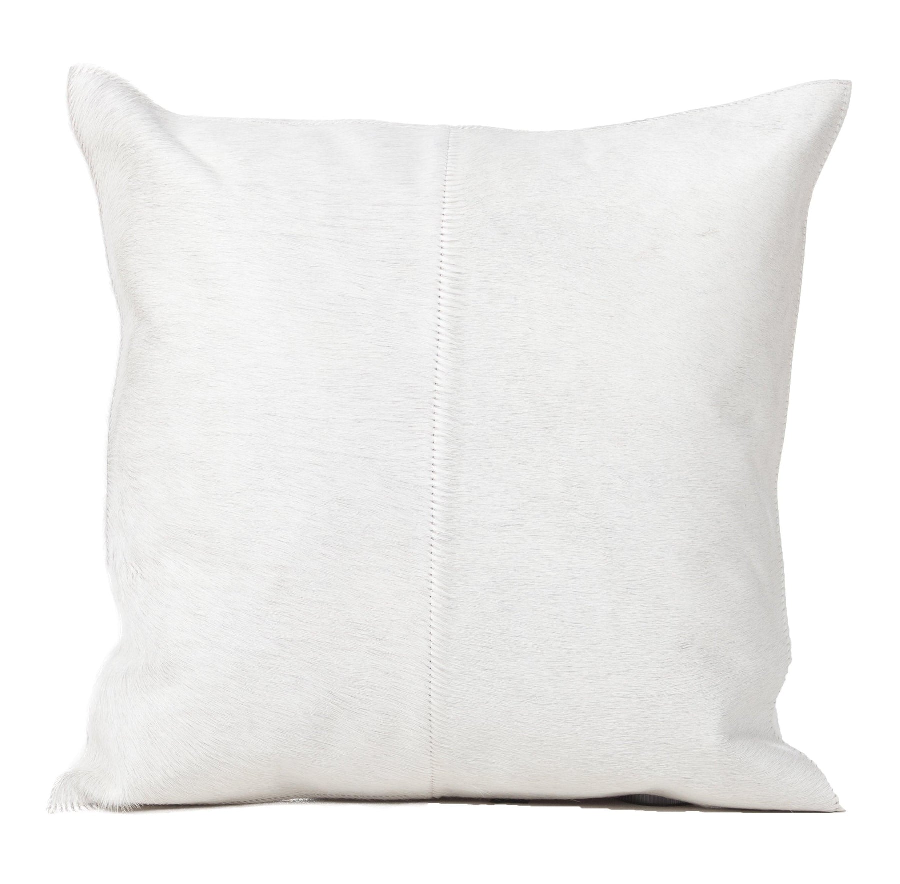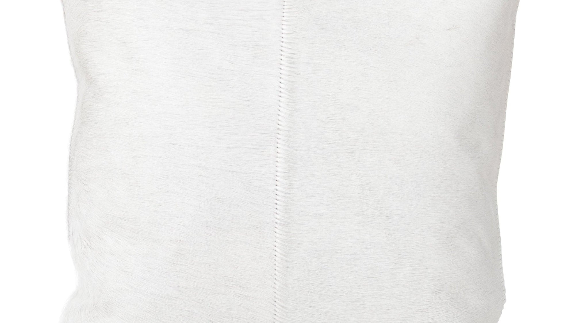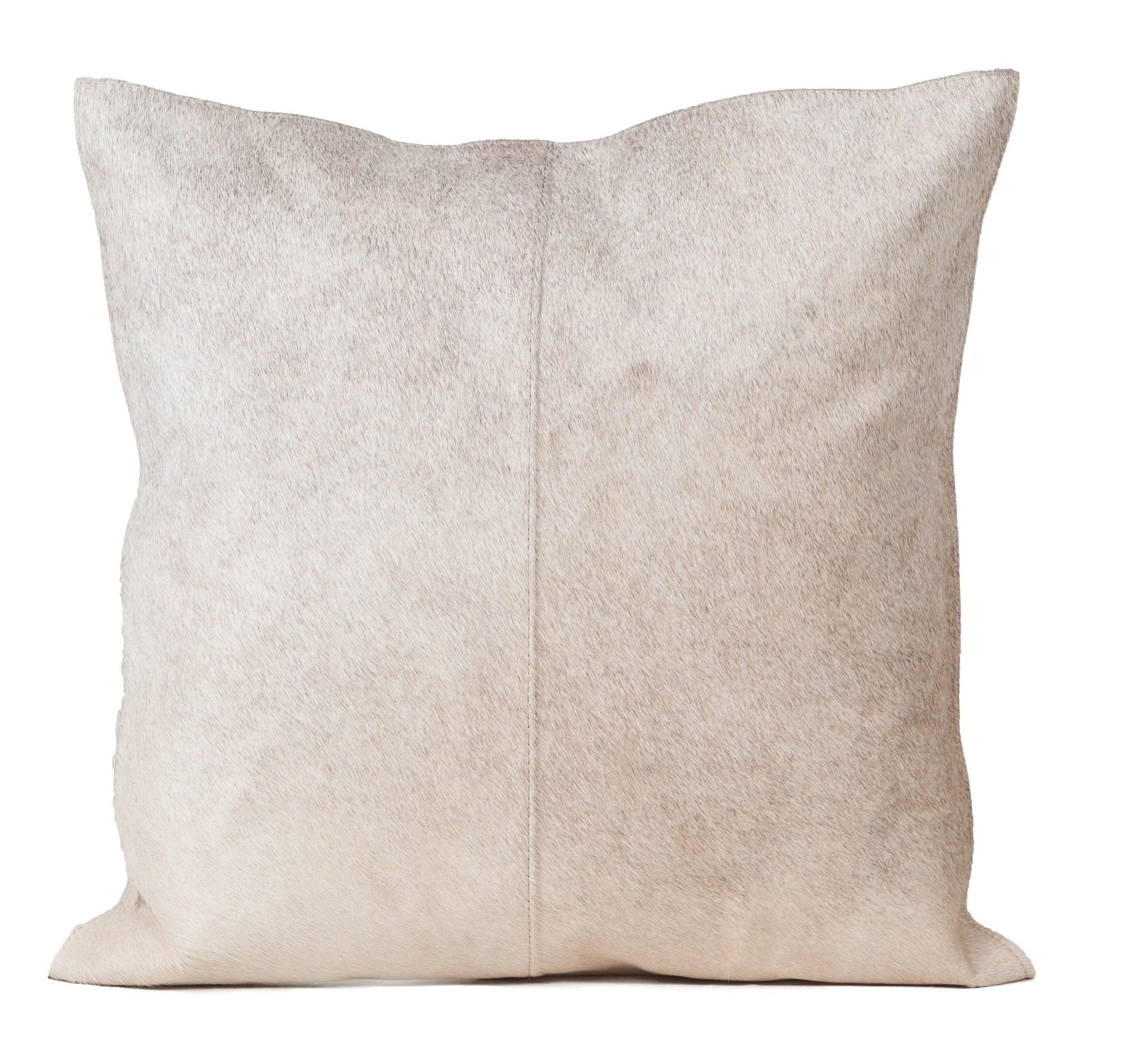This indoor square cushion features a natural grey hair on cowhide leather front designed to add texture and depth to seating areas. Made with 100% cowhide in its natural undyed color, each cushion displays unique variations in tone and pattern. The cushion measures 20" W x 20" H x 4" D, making it suitable for sofas, accent chairs, or beds. A feather and down insert provides a soft yet supportive feel for everyday use. Due to the natural characteristics of genuine cowhide, variations and imperfections are expected, and each piece may differ from the images shown. Designed for indoor use only and requires dry clean care.