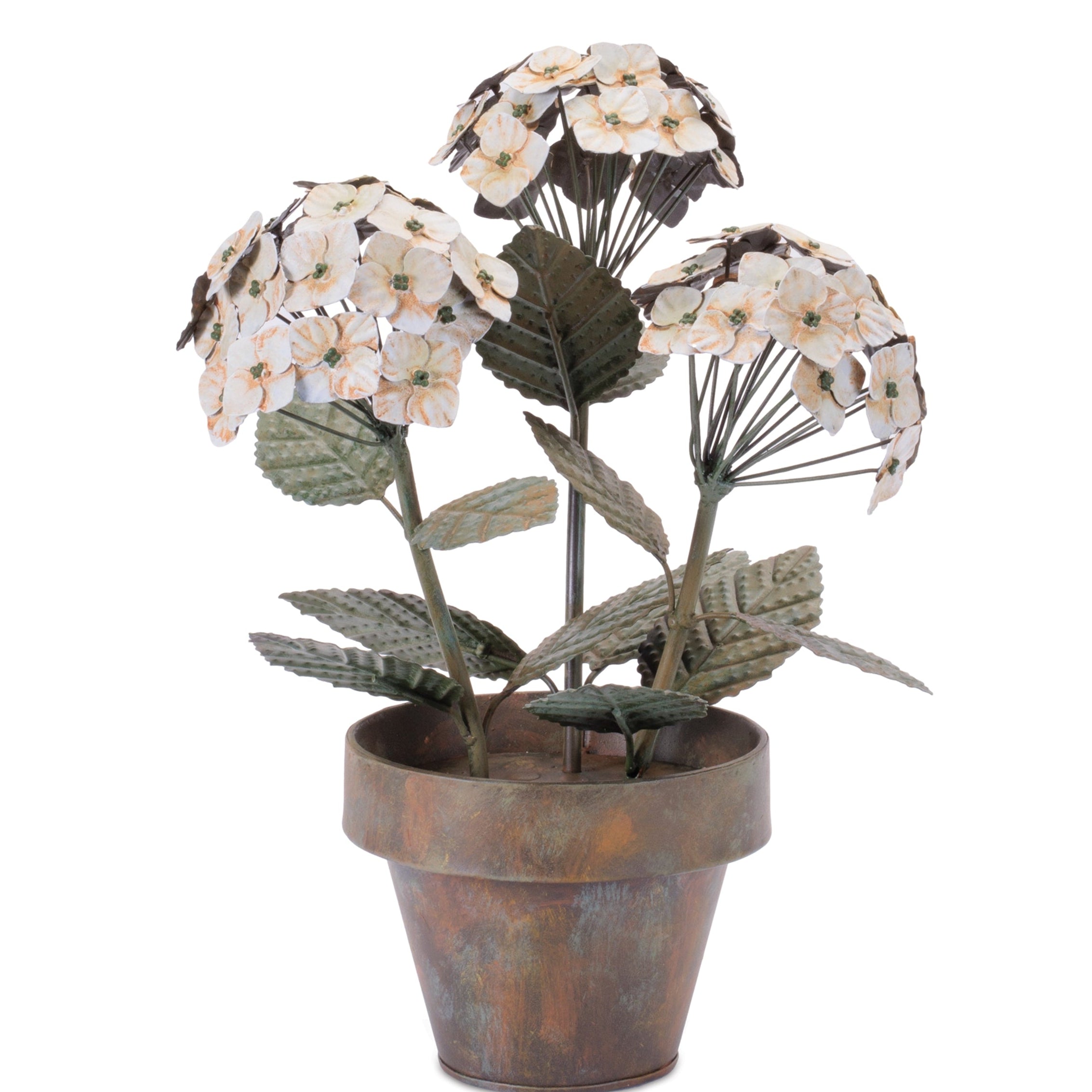Iron Hydrangea Floral Sculpture (15"H) – White Potted Garden Accent with Rustic Finish Indoor Decor by Melrose