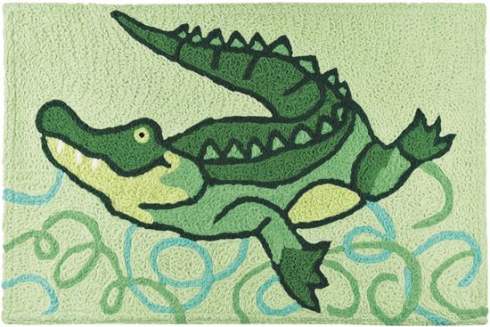 Gator lovers will enjoy the gift of this Jellybean accent rug. A large green gator swings its tail in the sage green water above a tangle of blue and green plants on the water`s floor. The waters on this accent rug will remain clear with machine washable polyester fibers. The polyester fibers are crafted partially of recycled bottles.