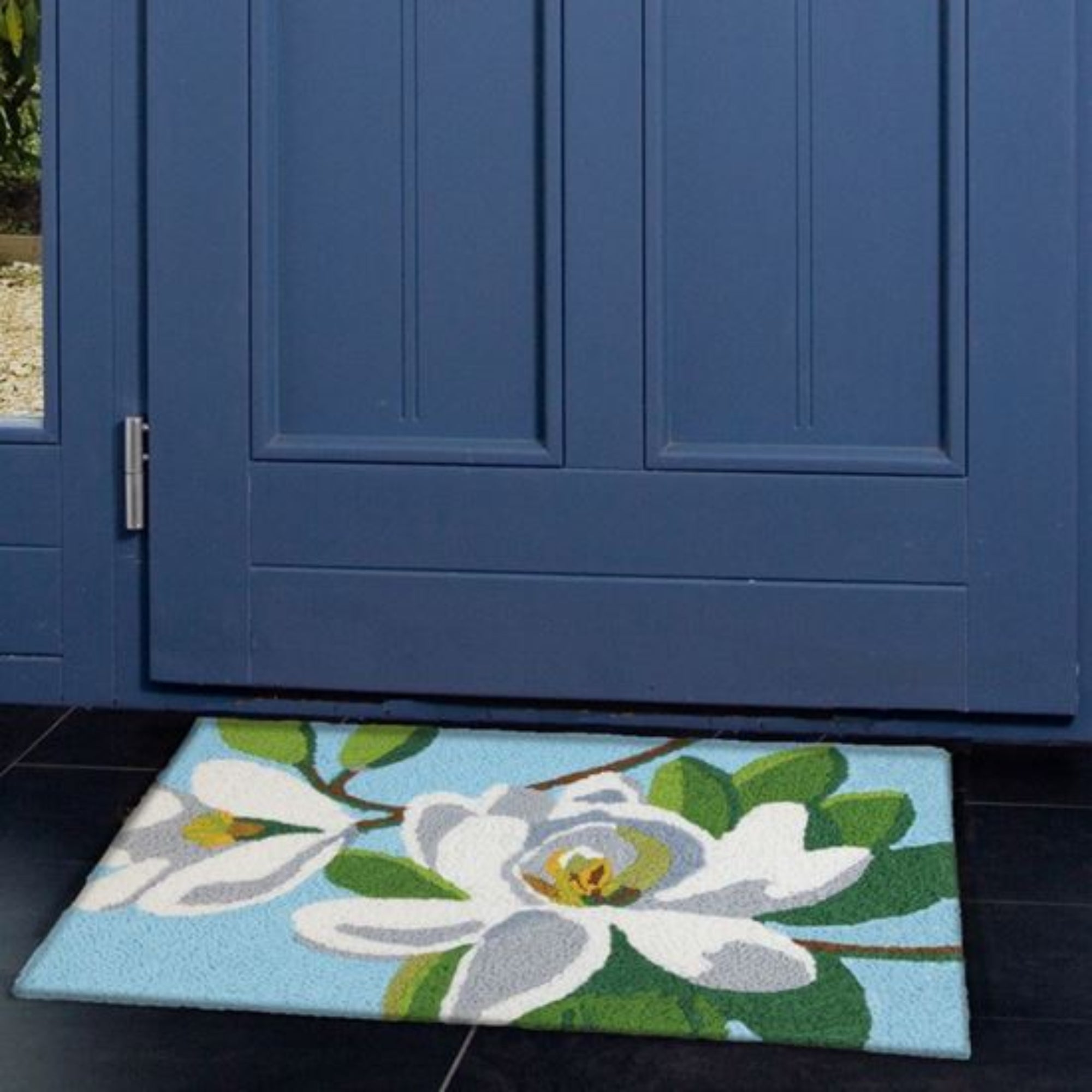 White magnolia leaves with accents of gray dominate this Jellybean accent rug design. The lush green leaves and thin brown stems sand out against the sky blue backdrop. Machine washable and versatile, this design will fit well inside your home, entering your office or leading out to your garden.