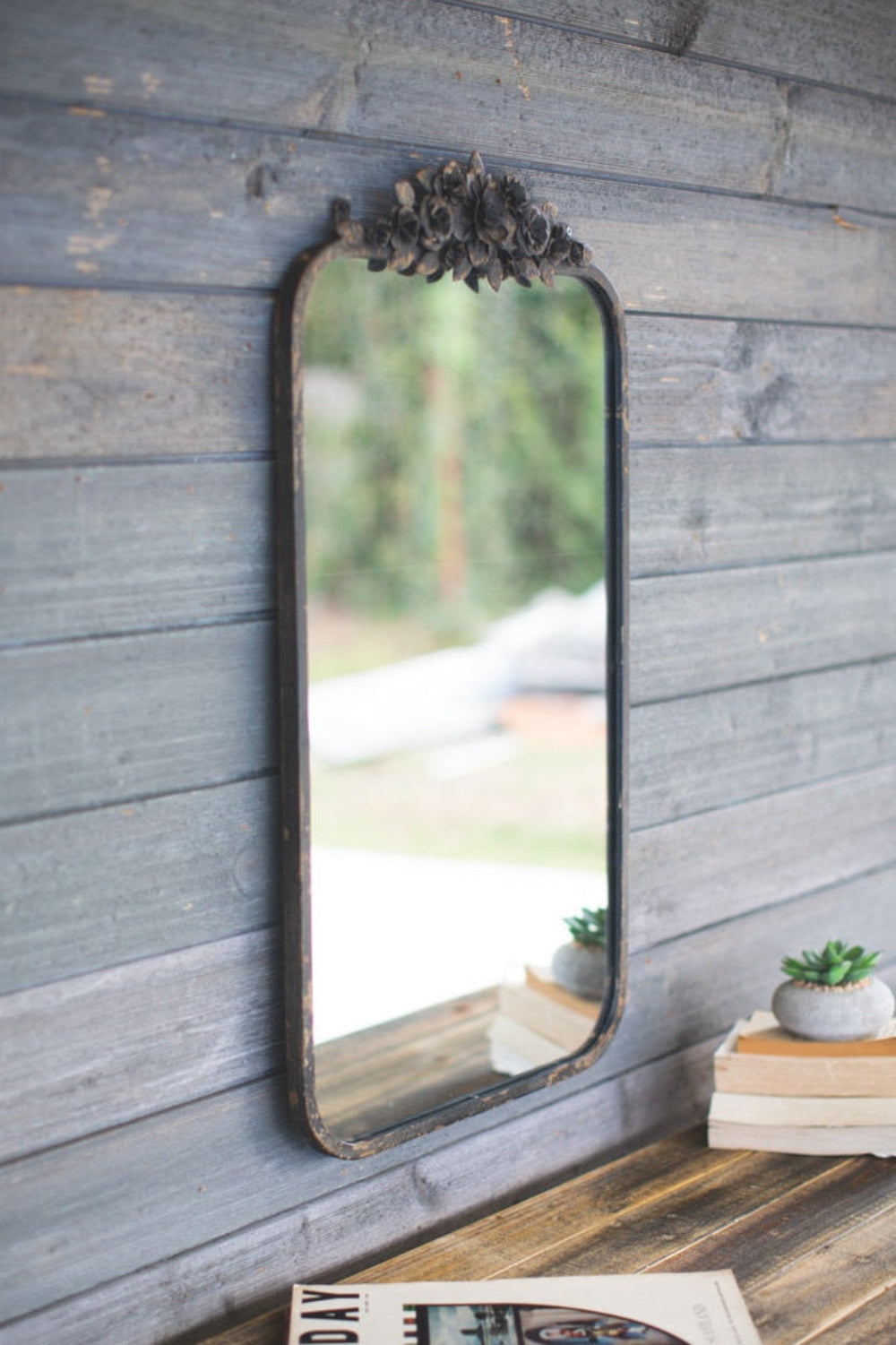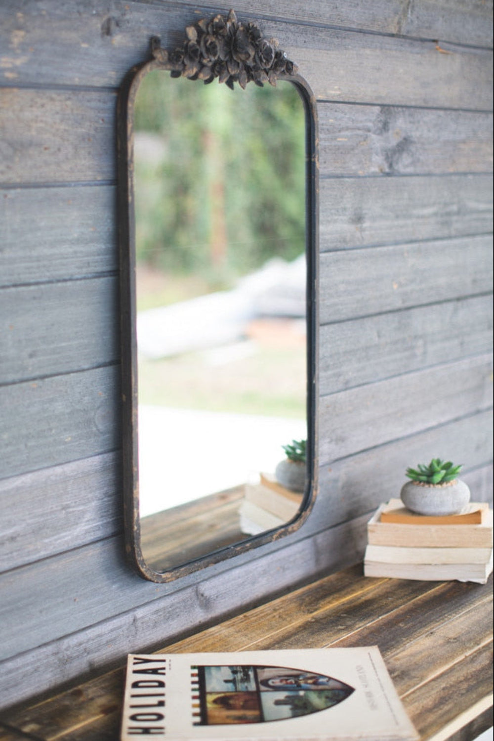 SKU - KAL-CCG1555Rectangle Metal Mirror with Flower Details 32"H – Gray Farmhouse Wall Mirror