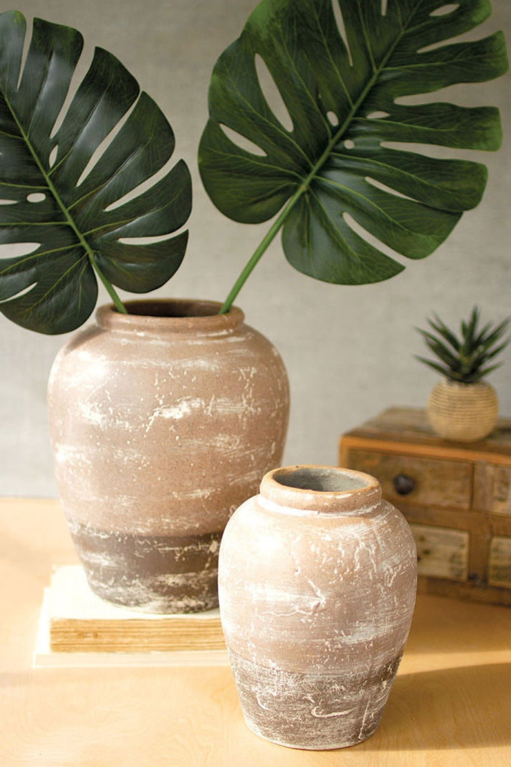 SKU - KAL-CDL3135Ceramic Two-Toned Urns, 12" Tall, White-Washed Finish, Decorative Tan Ceramic (Set of Two)