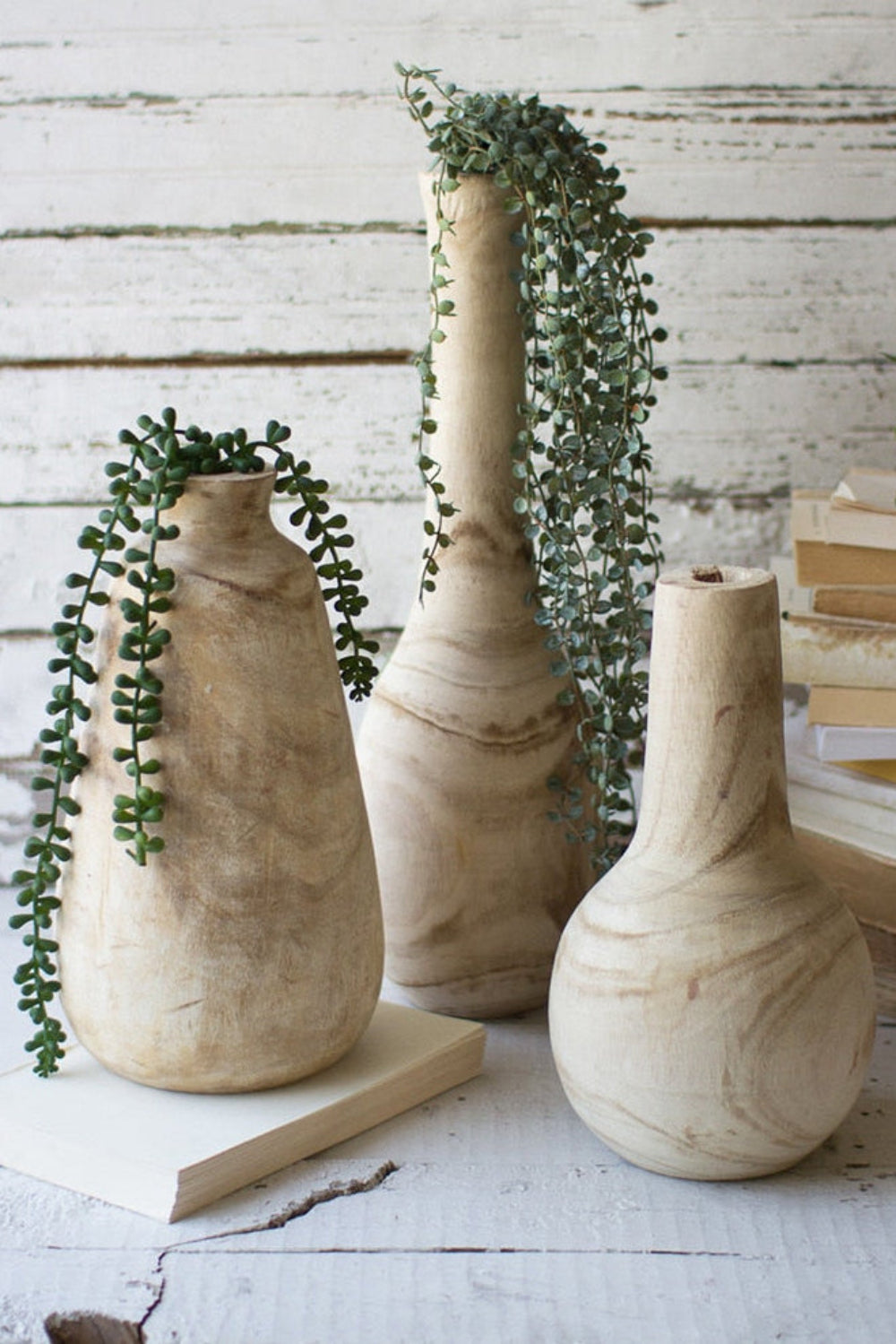 SKU - KAL-CFAN1000- Set includes three handcrafted wooden vases in graduated sizes