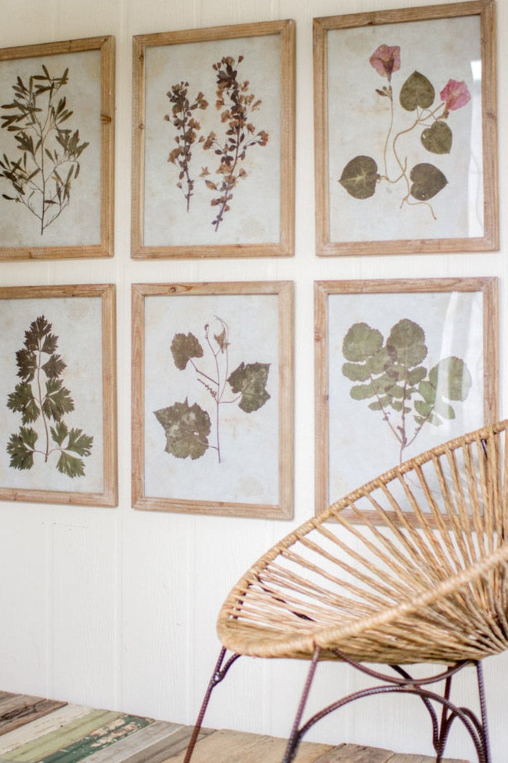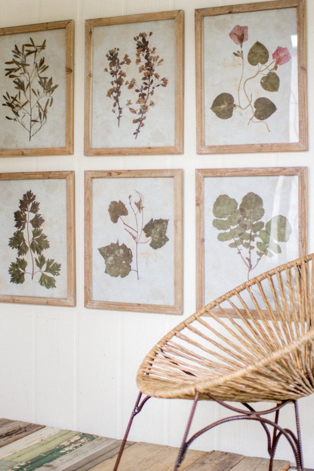 Refresh your walls with timeless botanical beauty using the Set of Six Leaf Prints Under Glass by Kalalou. Each piece features an elegant leaf illustration in soft, muted tones, set under glass and framed in distressed brown wood for a natural, vintage-inspired appeal. Perfect for cottage, farmhouse, or classic interiors, this six-piece wall décor set can be arranged together for a gallery effect or displayed separately throughout your home for cohesive charm.